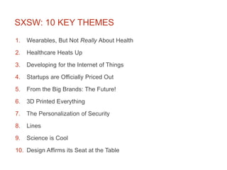 1. The document summarizes the key themes from the 2014 SXSW conference, including the prominence of wearable technologies and healthcare startups, but also a focus on developing for the Internet of Things and issues around privacy and security.
