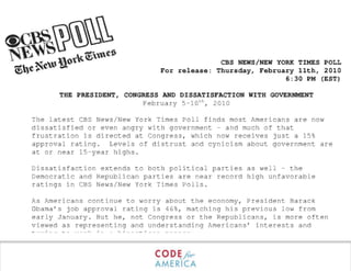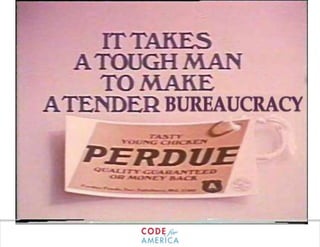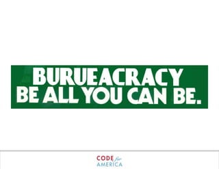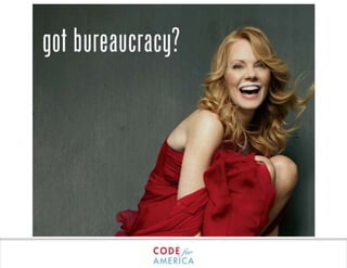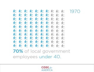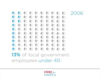 Code for America recruits leading web and tech professionals and recent graduates who have a passion for public service to become Code for America fellows. They accept only 5.5% of applicants into their fellowship program where fellows work with city governments to help fix issues through developing technology solutions. Some ways they aim to fix government include stopping the reinvention of existing solutions, making data more useful, letting citizens help fill service gaps, making bureaucracy more efficient, leveraging demographic trends, and listening to millennials.