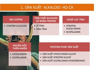 Tài liệu trình bày quy trình sản xuất các loại alcaloid từ dược liệu, đặc biệt là từ họ cà và các cây khác như hoàng đắng, hoàng bá. Các alcaloid như atropin, hyoscyamin, scopolamin và berberin có tính chất hóa học và dược lý quan trọng, được ứng dụng trong y học. Phương pháp chiết xuất và sản xuất các hợp chất này được mô tả chi tiết cùng với các giai đoạn tinh chế.