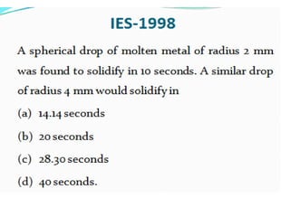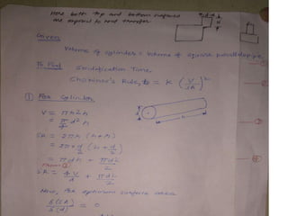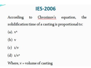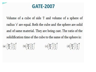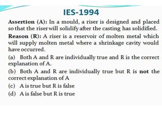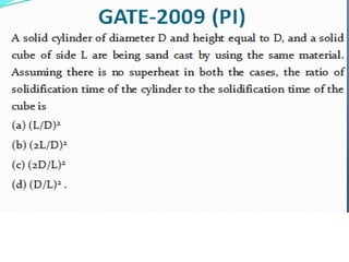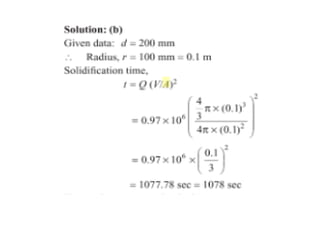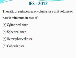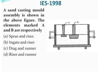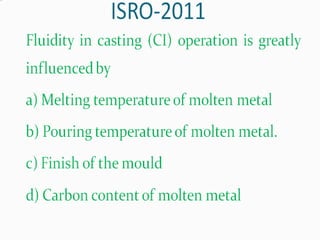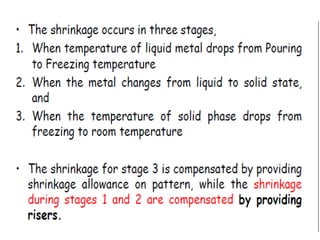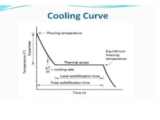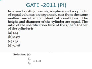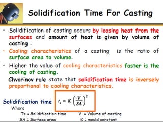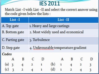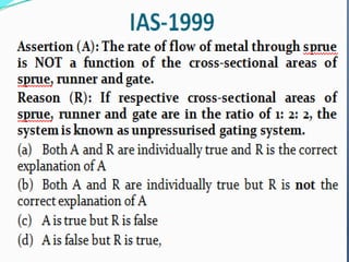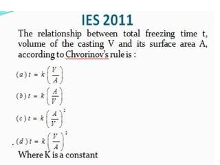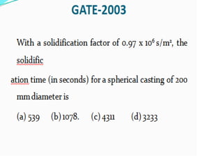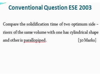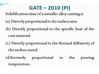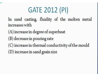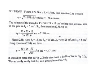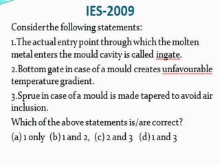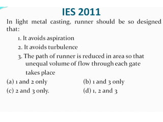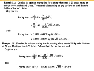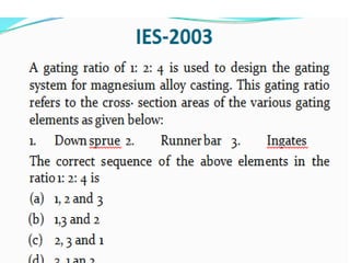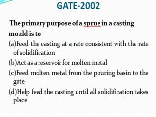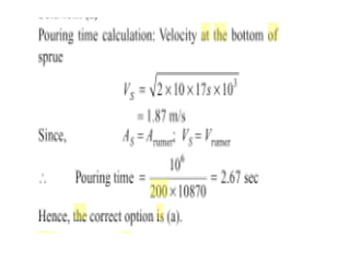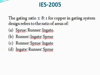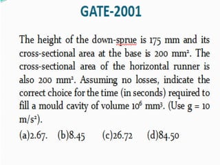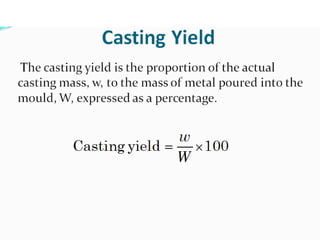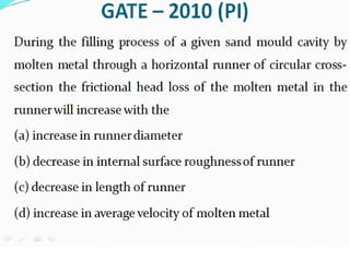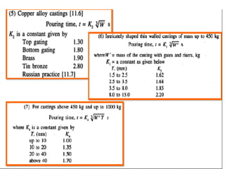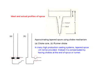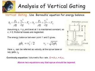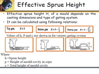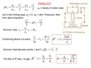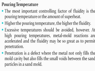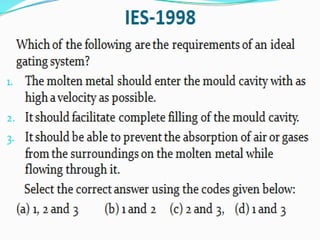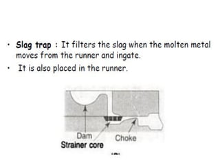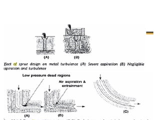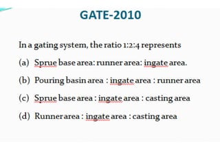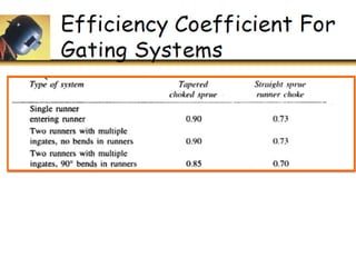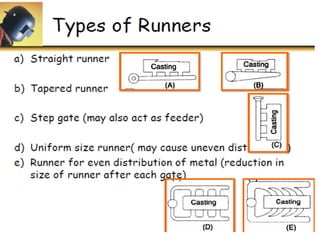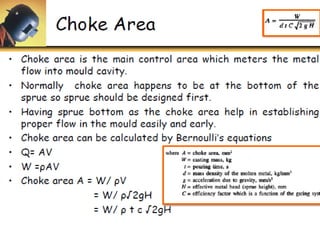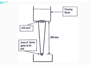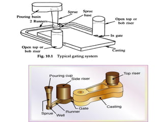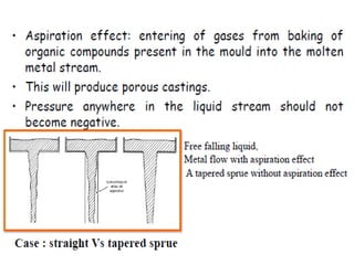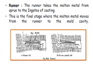 This document discusses the key elements of a gating system for metal casting, including the pouring basin, sprue, runner, and gates. It describes the components and their purposes to provide smooth, controlled filling of the mould cavity. An optimal gating system avoids turbulence, prevents impurities from entering the mould, and maintains proper thermal gradients. The document also covers factors like pouring rate and choke area that influence metal flow, and recommends tapered shapes and gradual transitions to minimize defects.