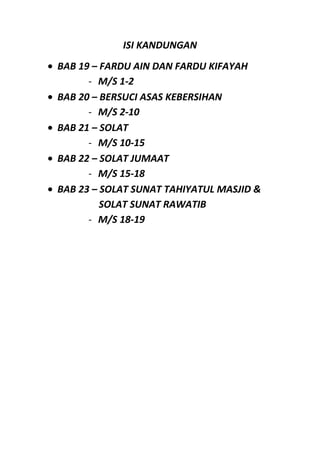 Dokumen ini adalah tentang pendidikan agama Islam dan mengandungi pelbagai bab mengenai fardu ain, fardu kifayah, serta amalan bersuci. Ia menjelaskan kepentingan mengamalkan fardu ain dan kifayah serta akibat mengabaikannya bagi individu, masyarakat, dan negara. Selain itu, ia merangkumi konsep bersuci, jenis najis, serta tatacara berwuduk dan mandi.