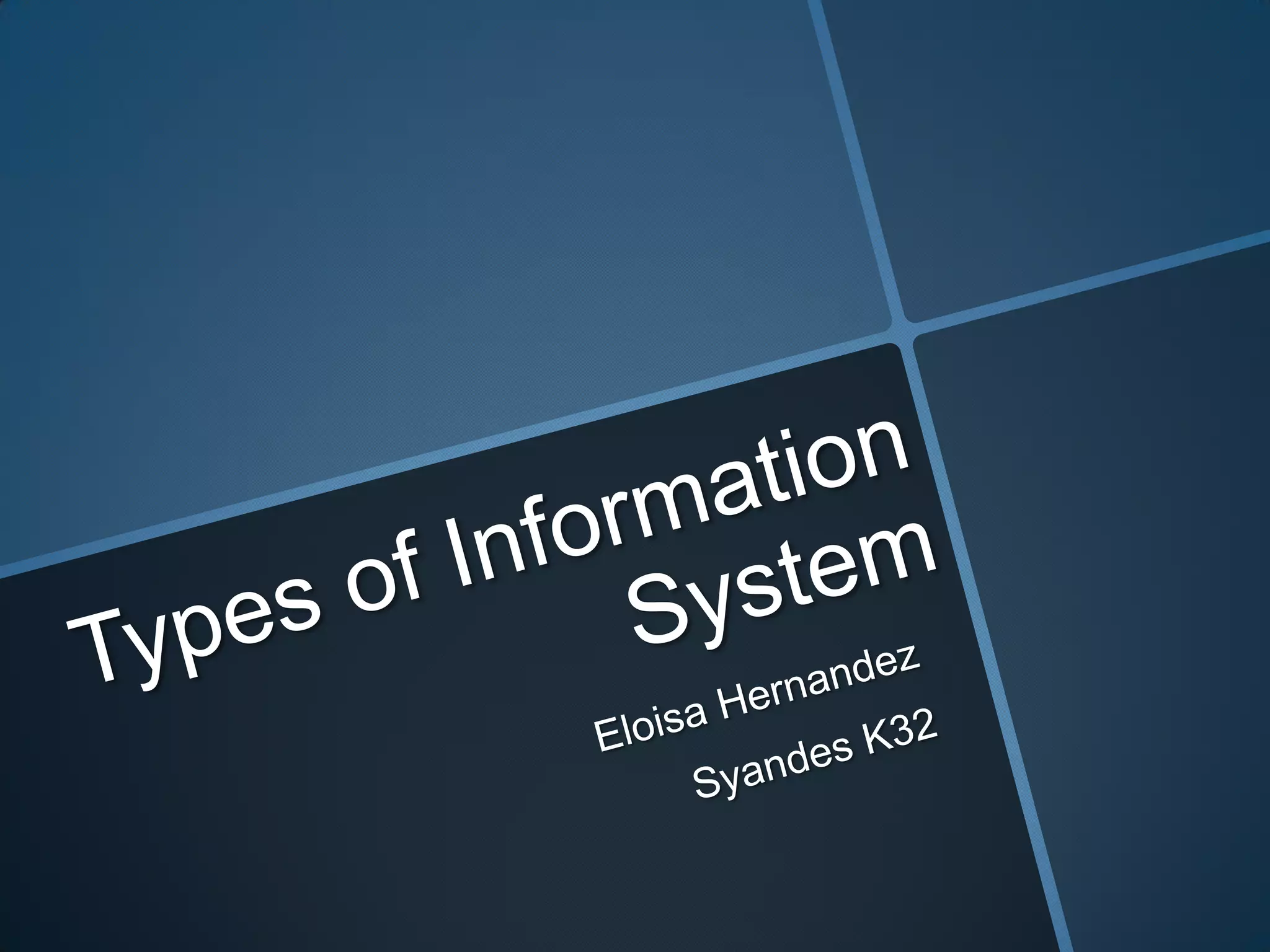 The document defines and provides examples of different types of information systems: Transaction Processing Systems (TPS) which record daily business transactions; Office Automation Systems (OAS) which allow employees to perform tasks electronically; Knowledge Work Systems (KWS) which promote knowledge creation and sharing; Decision Support Systems (DSS) which help managers make decisions from various data sources; Executive Support Systems (ESS) which provide executive-level reports; and Group Decision Support Systems (GDSS) which support collaborative group projects through digital tools and resources. Each system type is defined and examples of related systems are provided.