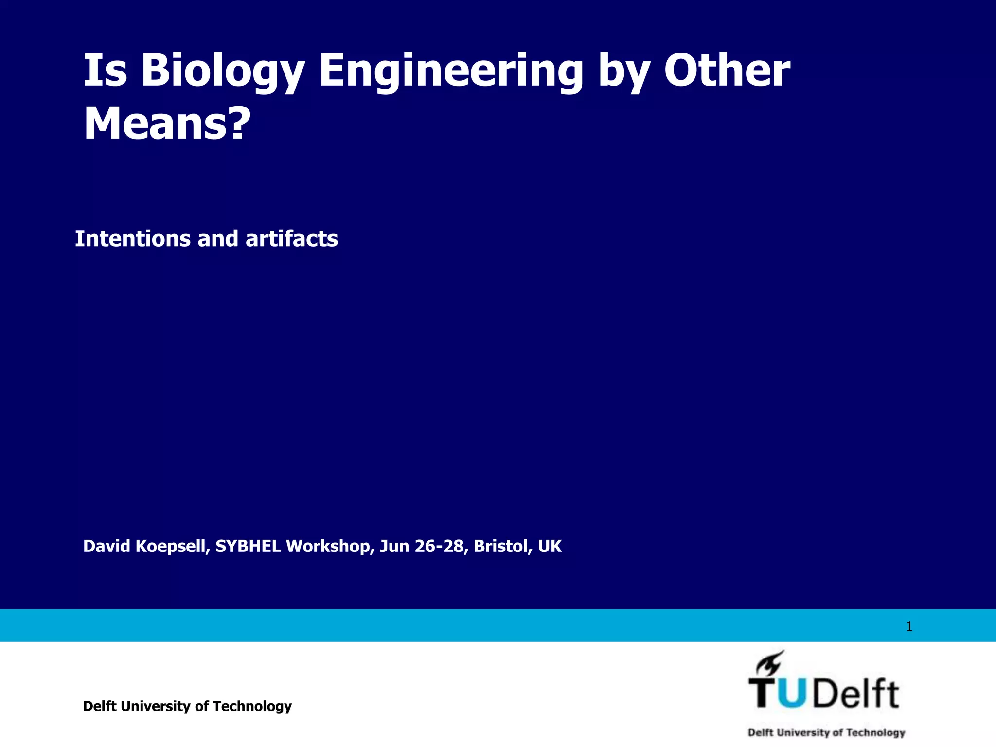 The document discusses the ontology of artifacts and the role of intention. It argues that artifacts are distinct from natural objects because they are produced through human intention to fulfill a purpose. While biology itself is not directed by intention, engineering is an intentional process. Therefore, engineers working in fields like synthetic biology must design systems and technologies to incorporate important values like beneficence, non-maleficence, dignity, and justice. Specifically, they should build limitations and positive values into biological artifacts to guide their effects and ensure they are used for good.