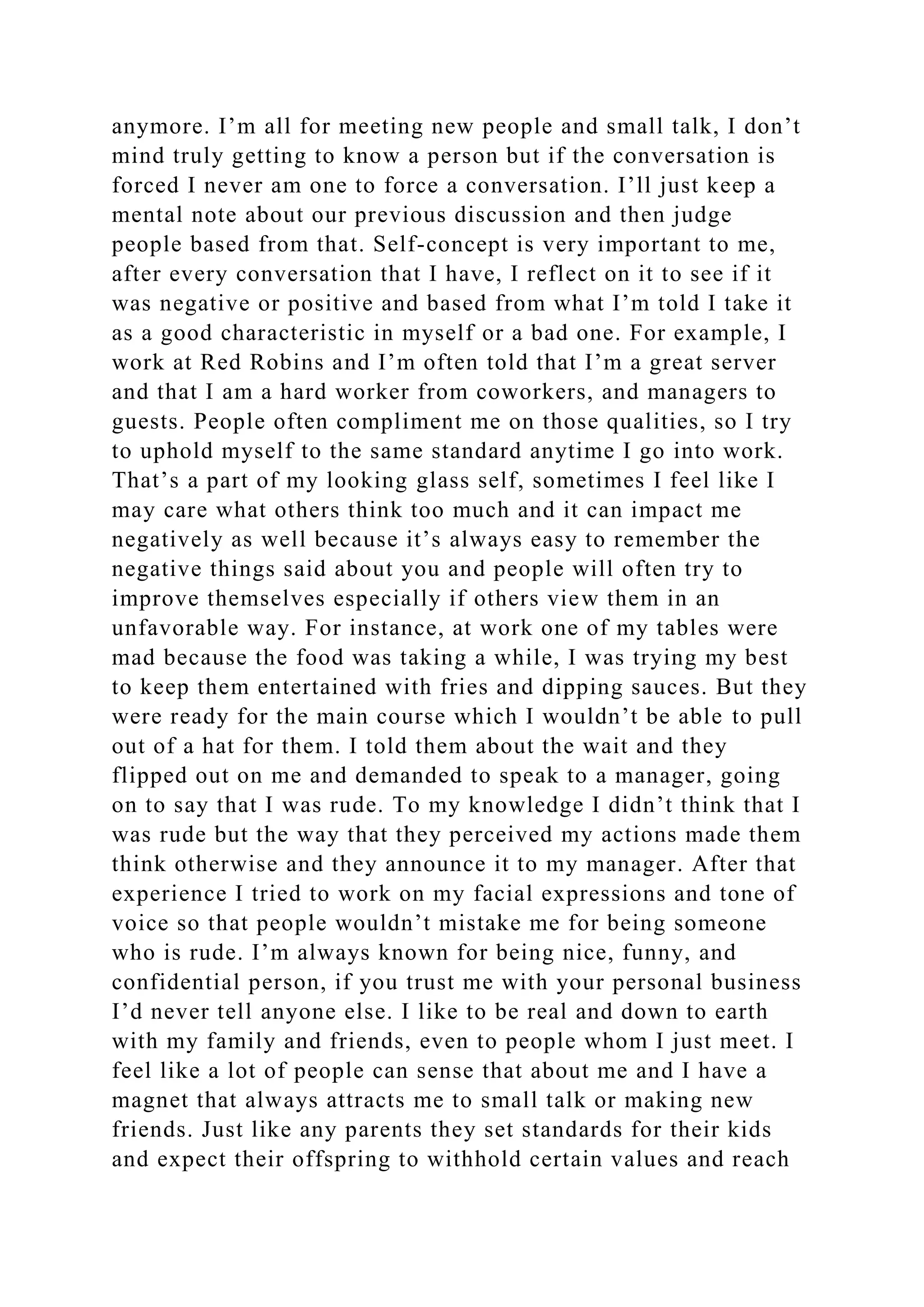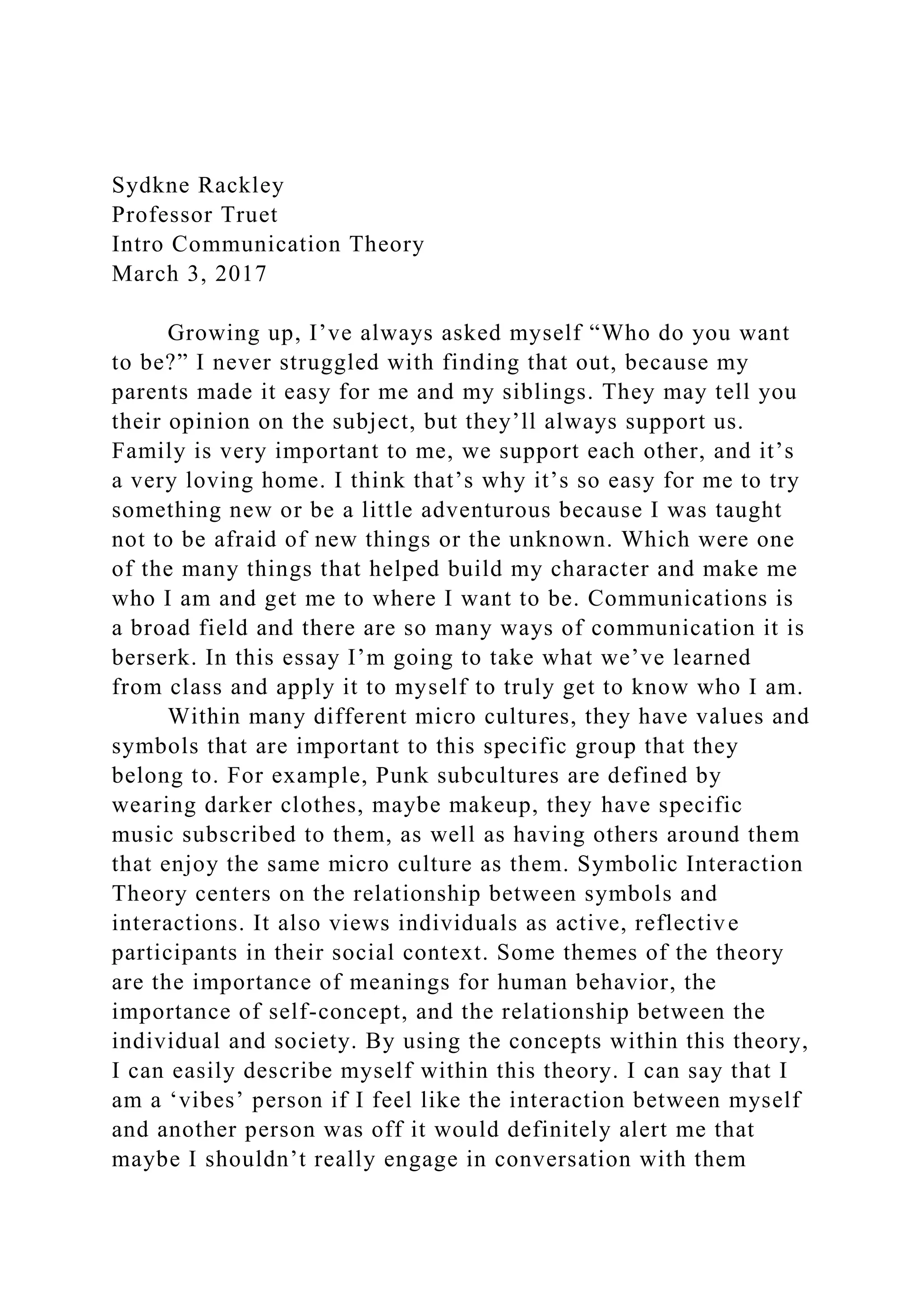 The essay reflects on the author's personal growth and communication style, heavily influenced by their supportive family and various communication theories. It explores concepts like symbolic interaction theory, cognitive dissonance theory, and expectancy violations theory, applying them to the author's experiences and interactions. The author emphasizes the importance of self-concept, adaptability, and the drive to challenge themselves while valuing personal connections and understanding social nuances.