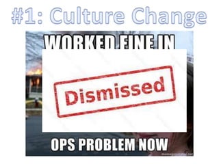 DevOps aims to improve collaboration between development and operations teams. When these teams are disconnected, it can lead to severe production issues from a lack of shared understanding and tools. Organizations should strive for agile deployments by implementing continuous integration and deployment pipelines. Pushing changes to production without proper planning, such as failing to optimize critical pages, can also cause problems. Establishing metrics and monitoring across the entire software lifecycle helps align teams and catch issues early.