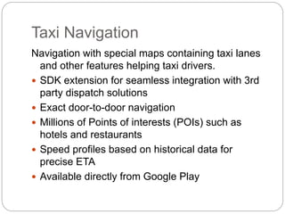 This document summarizes navigation software features for taxis, including: