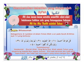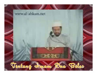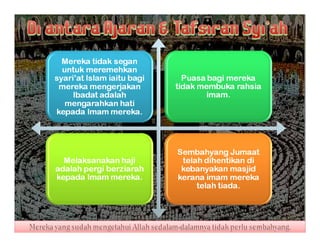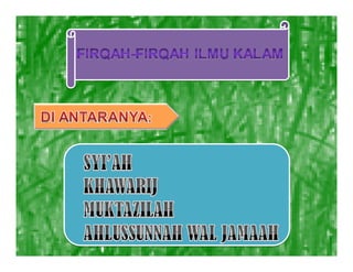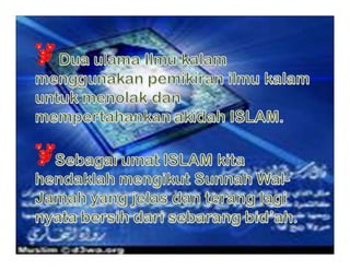 Dokumen tersebut membahas tentang ilmu kalam sebagai upaya awal umat Islam dalam membahas masalah akidah dengan menggunakan dalil-dalil akal untuk membela dan mempertahankan kebenaran agama. Dokumen ini juga membahas mengenai perbedaan pandangan antara Ahli Sunnah Wal Jamaah dan Syiah terkait khalifah dan imamah.