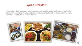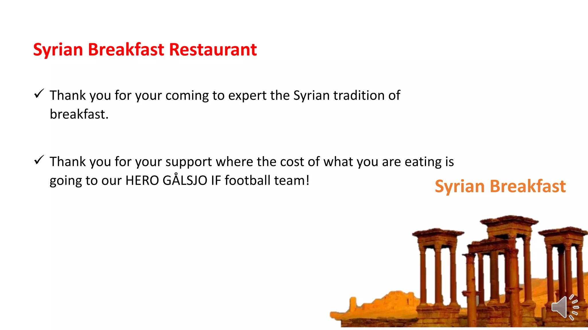 This document describes the types of breakfast offered at the Syrian Breakfast Restaurant. It is divided into three main types: everyday breakfast, weekend breakfast, and drinks. Everyday breakfast includes items like labaneh, stuffed eggplant, and zaatar bread. Weekend breakfast brings Syrian families together and includes dishes like fatteh, hummus, bean salad, and kishkeh. Drinks include green tea with ginger and cinnamon as well as sahlab, a warm cinnamon-spiced milk drink. Proceeds from the restaurant go to supporting the local HERO GÅLSJO IF football team.