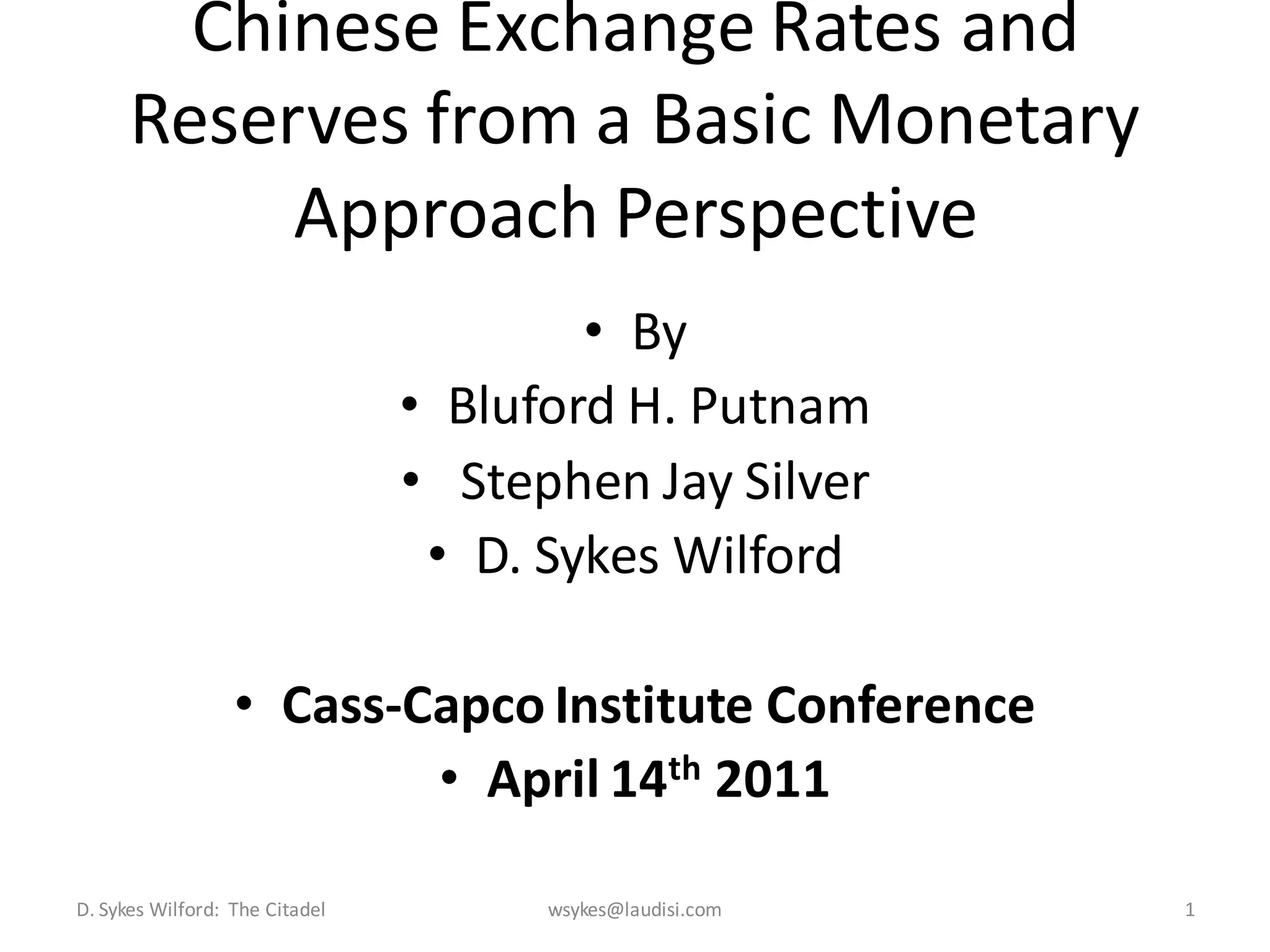The document discusses the Chinese exchange rates and reserves from a monetary approach perspective, emphasizing the accumulation of reserves as a key policy outcome. It highlights the relationship between reserve growth, domestic credit, and nominal income, illustrating the shifts in central bank policy following the Asian financial crisis. Additionally, it addresses potential risks and implications associated with revaluation and the impact of Chinese demographic changes on future monetary policy.