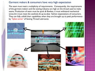 The document discusses the requirements and expectations for sewing thread from both garment makers and consumers. It must meet technical requirements for production as well as aesthetic fashion expectations. A variety of lubricants are introduced that optimize thread performance for different application methods and provide benefits such as homogenous coating, reduced friction and static, heat protection, and a wide application window. LNCI offers a full range of lubricants suitable for different fiber types and processing needs.