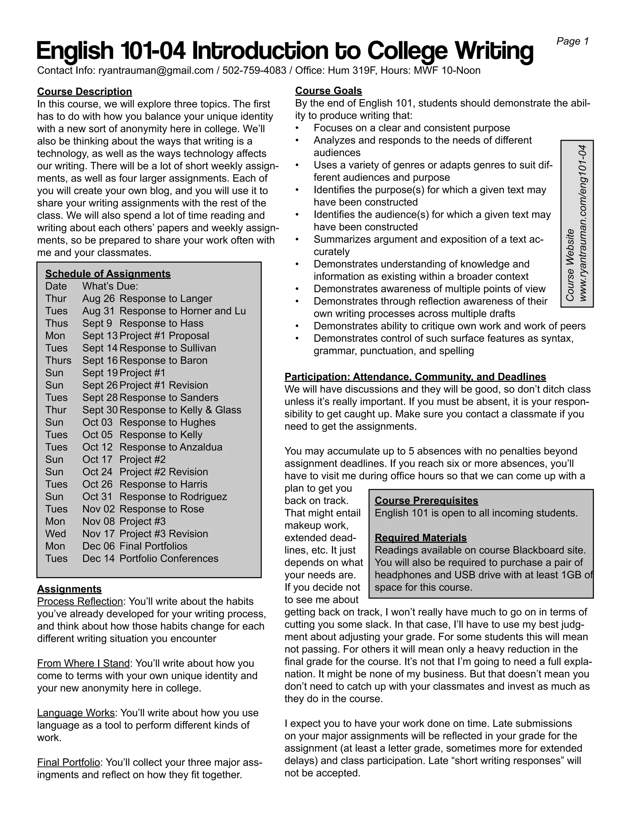 The syllabus outlines the goals, assignments, policies, and schedule for an introductory college writing course, which will explore identity, writing as technology, and include weekly writing assignments, larger projects, and using student blogs to share work with classmates. Students will develop their writing skills through reflections, essays, and revising work based on peer and instructor feedback to earn a final grade determined by assignments, responses, and participation.