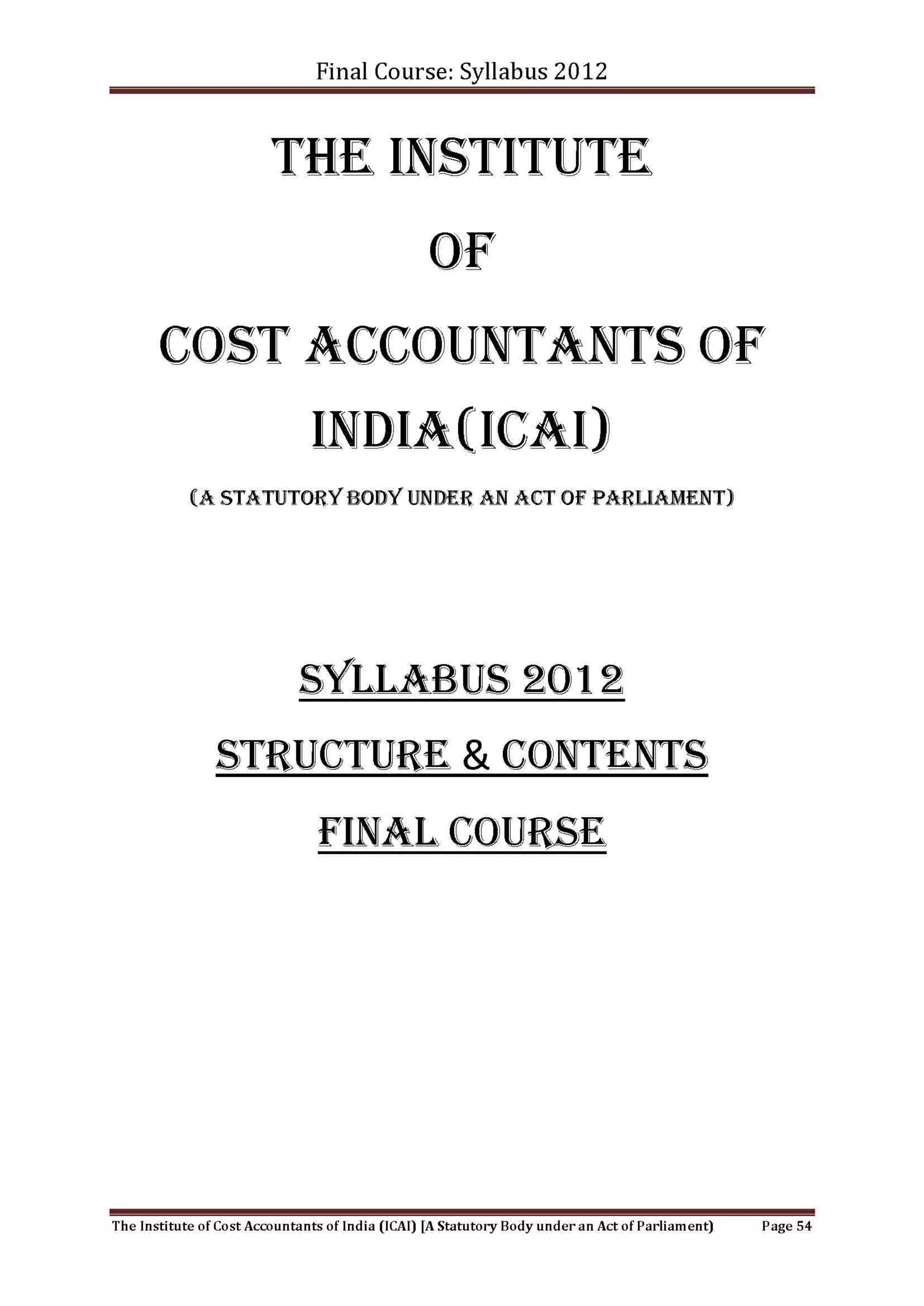 The document outlines the syllabus for the Foundation Course conducted by the Institute of Cost Accountants of India. It includes 4 papers that cover topics such as fundamentals of economics, management, accounting, laws, and ethics. For each paper, the syllabus structure divides topics into sections and specifies their weightages. It provides learning objectives, assessment strategies, and skill levels required for each paper. The syllabus also lists the topics covered in each section along with their brief descriptions and weightages.