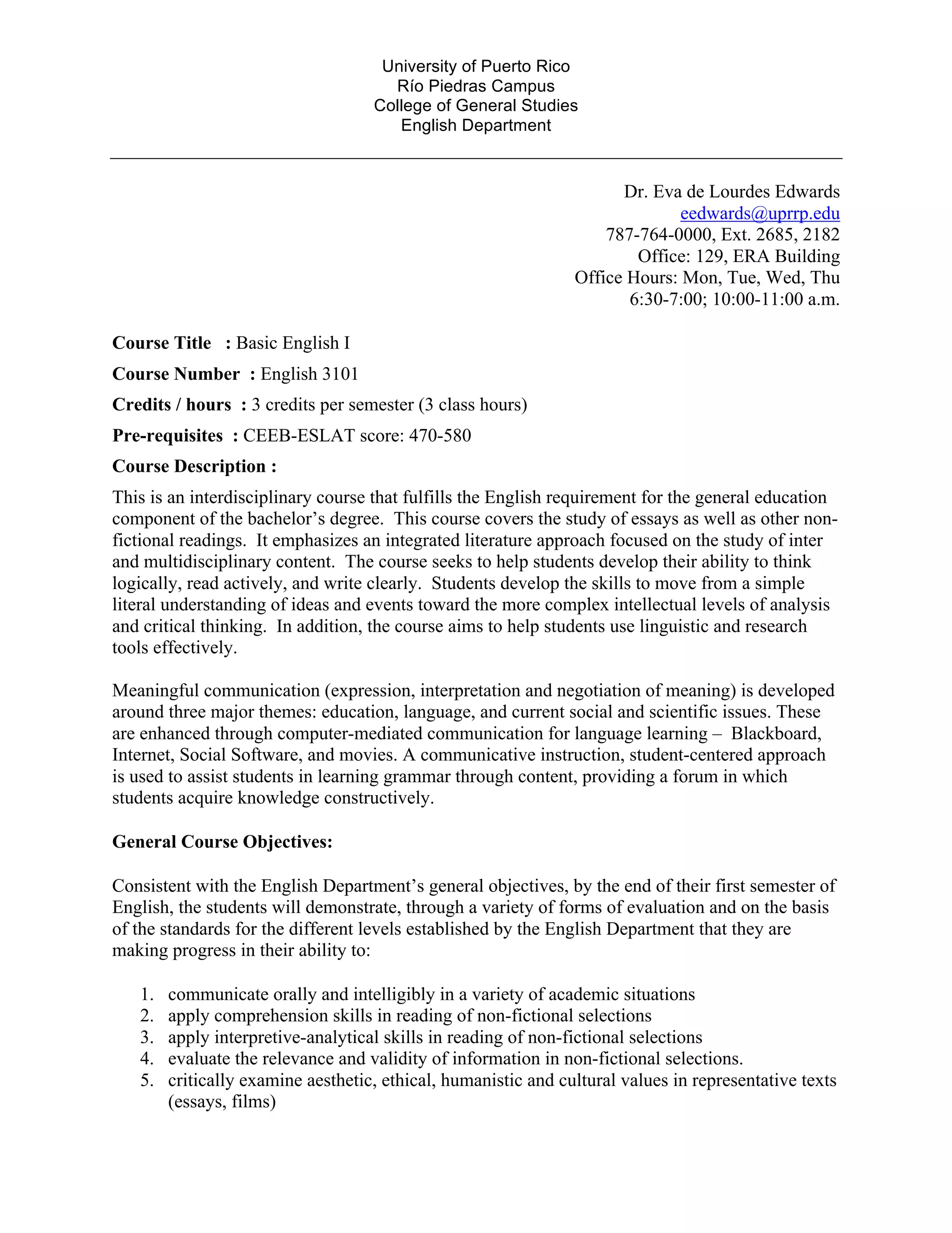 This document provides information about a Basic English I course taught at the University of Puerto Rico, Río Piedras Campus. It includes details about the instructor, course objectives, topics to be covered each week, evaluation methods, required materials and policies.