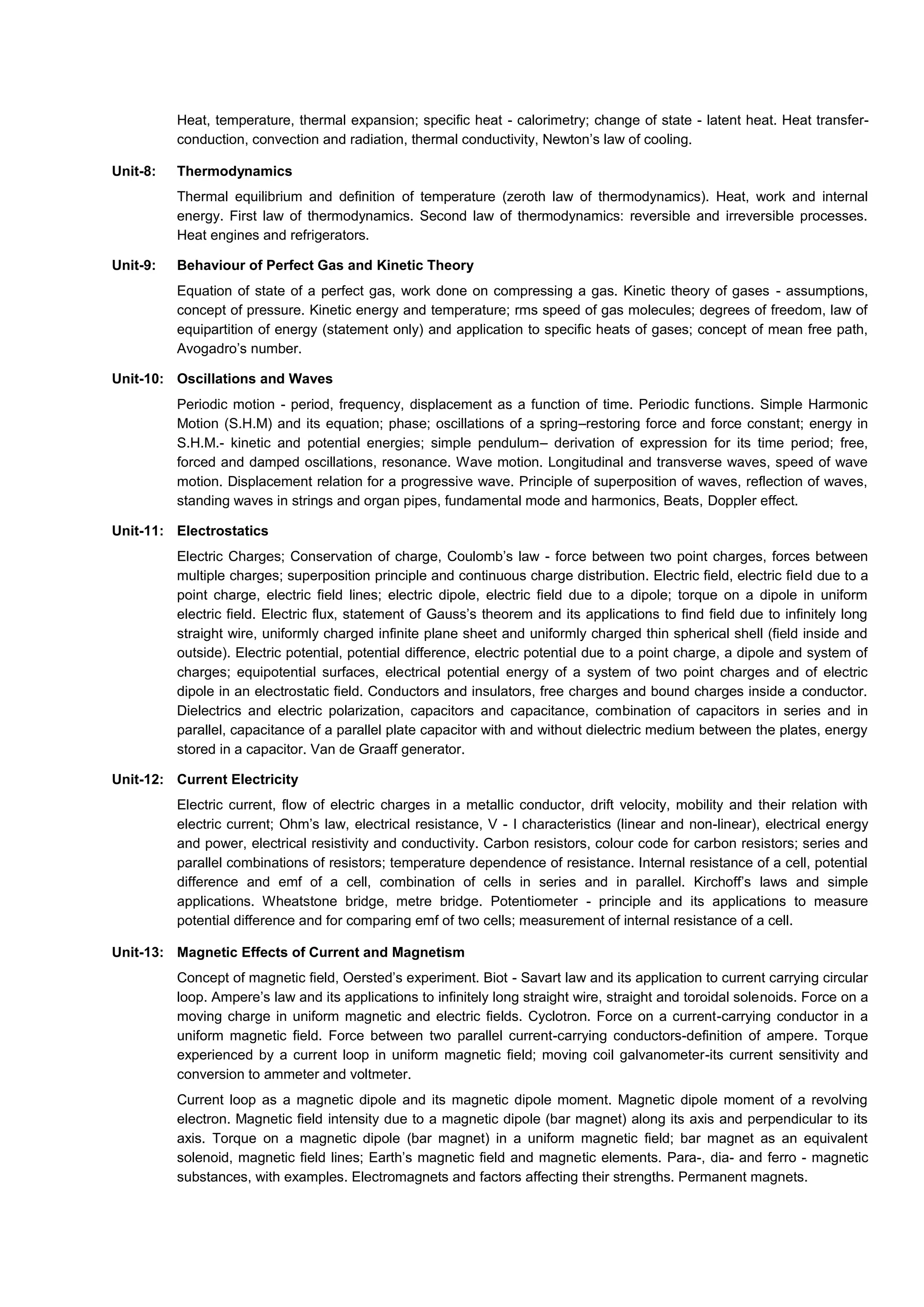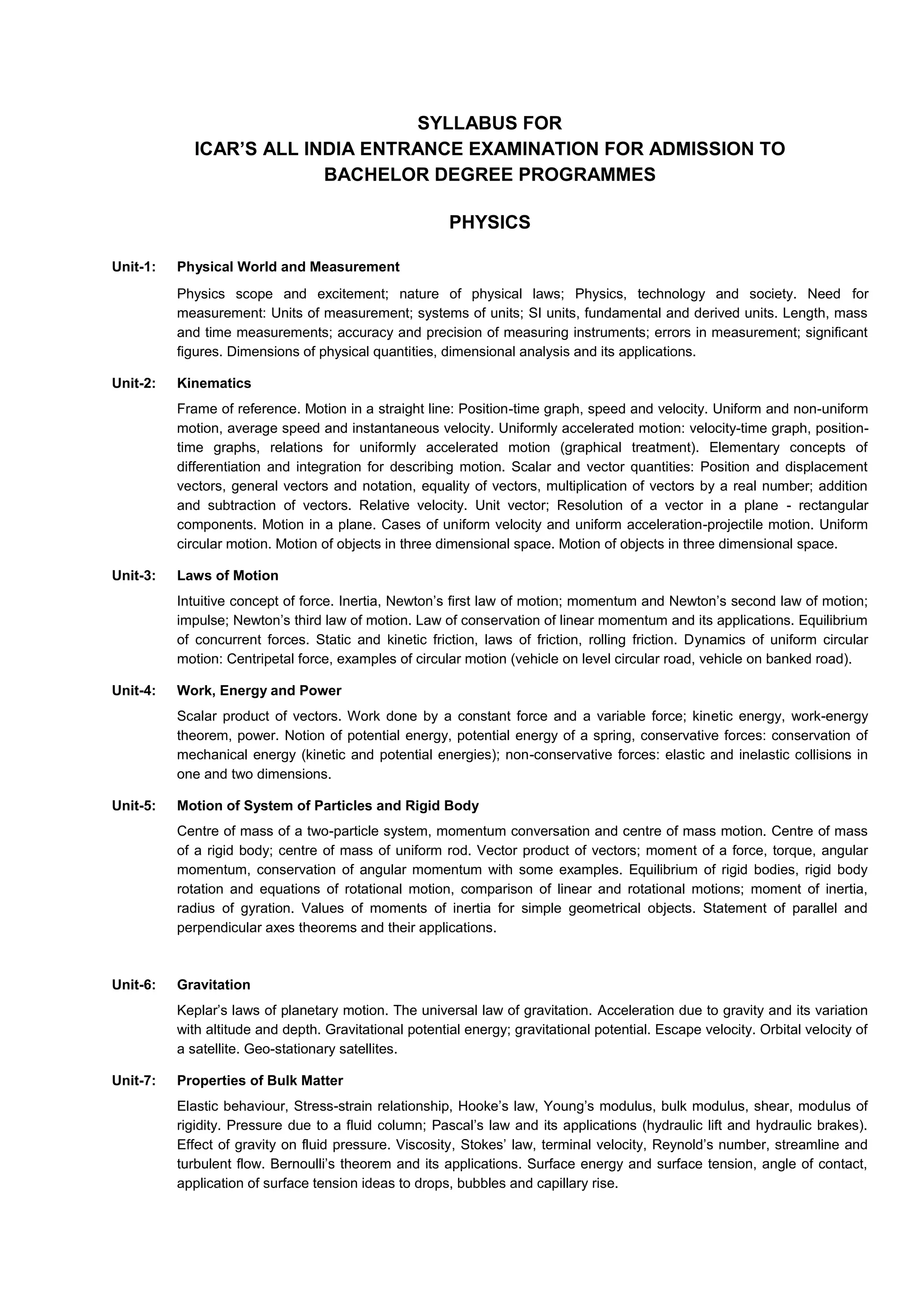 This document provides a syllabus for the ICAR's All India Entrance Examination for admission to Bachelor's degree programmes in Physics and Chemistry. The Physics syllabus covers 20 units ranging from physical world and measurement to electromagnetic waves and optics. Key topics include kinematics, laws of motion, work, energy and power, gravitation, properties of matter, thermodynamics, oscillations and waves, electrostatics and electromagnetism. The Chemistry syllabus covers 15 units ranging from basic concepts to p-block elements. Key topics include atomic structure, chemical bonding, states of matter, thermodynamics, equilibrium, redox reactions, s-block elements and organic chemistry.