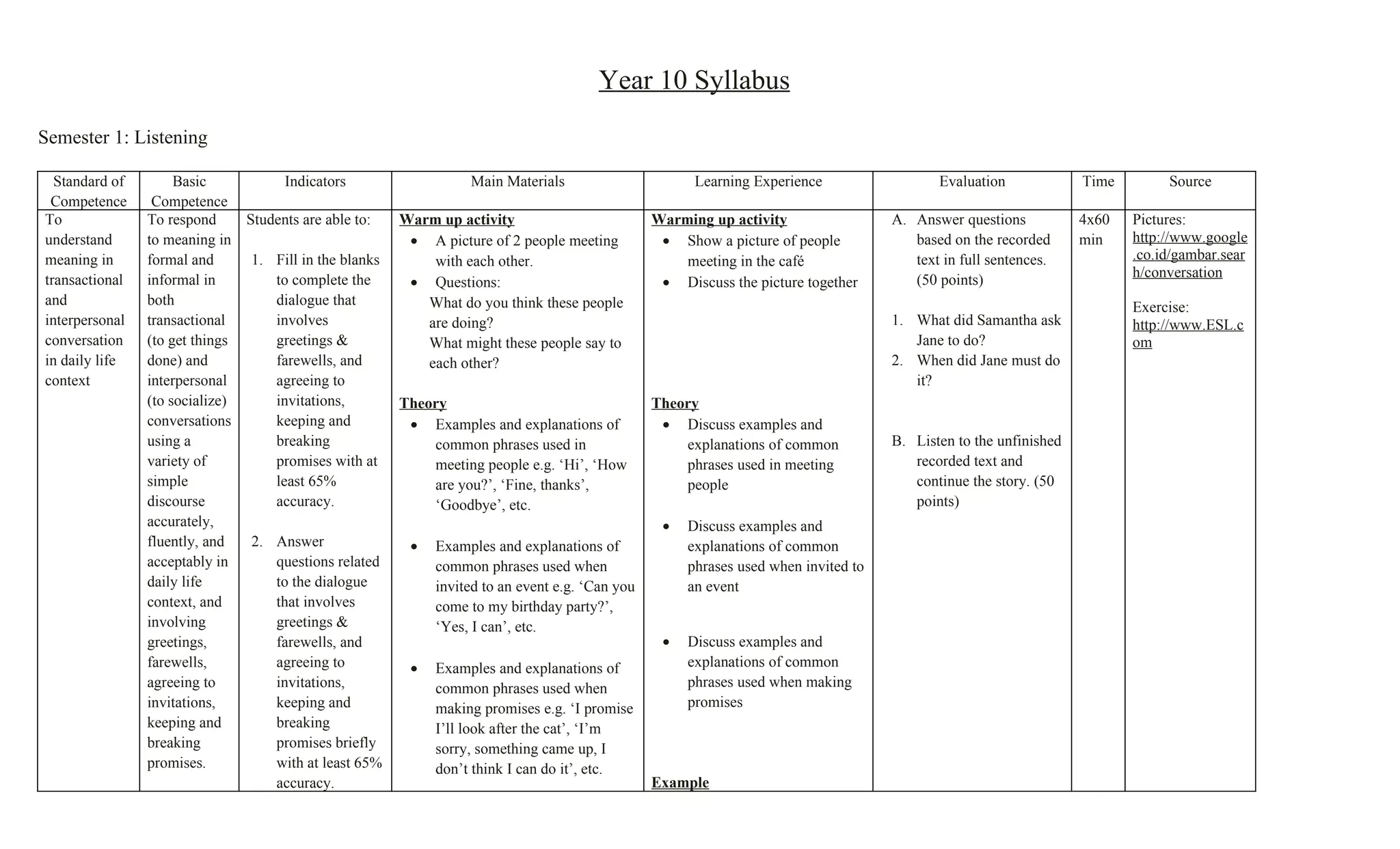 This document outlines the semester 1 listening syllabus for Year 10 students. It includes 3 key competencies: understanding meaning in conversations, recounting events, and following procedures. Students will practice filling in blanks, answering questions about recorded texts, and recounting personal experiences. Evaluation involves completing blanks and answering questions based on recordings. Lessons are 4x60 minutes per week and materials include internet resources, books, and pictures.
