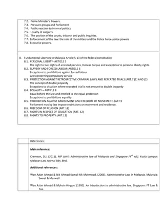 This document outlines the topics covered in the Constitutional Law II course. The course examines the contents of the Federal Constitution of Malaysia and covers conventions, subversion, emergency powers, constitutional amendments, and constitutional crises. It also discusses national leadership and the relationship between citizens, state, voters, and elections. A major section is devoted to fundamental liberties in Malaysia, including personal liberty, slavery, retroactive criminal laws, equality, freedom of movement, religion, education, and property rights. The course references administrative law books and articles on Malaysia and Singapore.