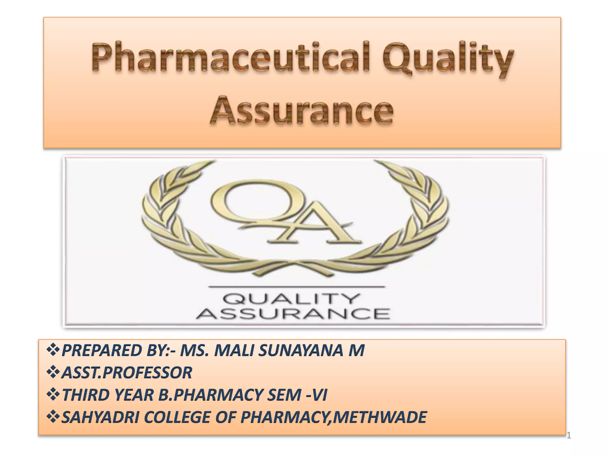 This document outlines a course on quality control and quality assurance aspects of the pharmaceutical industry. The course will cover key topics like cGMP, quality certifications, documentation, and regulatory affairs. Upon completing the course, students will understand cGMP requirements, quality documentation, certifications for pharmaceutical companies, and the roles of quality assurance and quality control departments. The course is divided into five units which will cover quality management systems, organization and facilities, quality control testing, documentation, validation, calibration, complaints, and warehousing.
