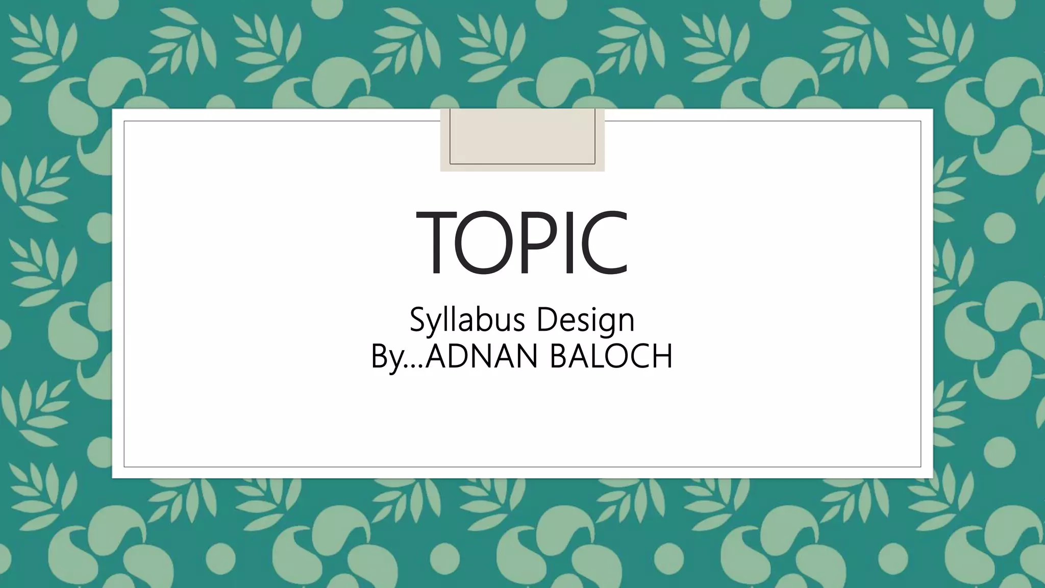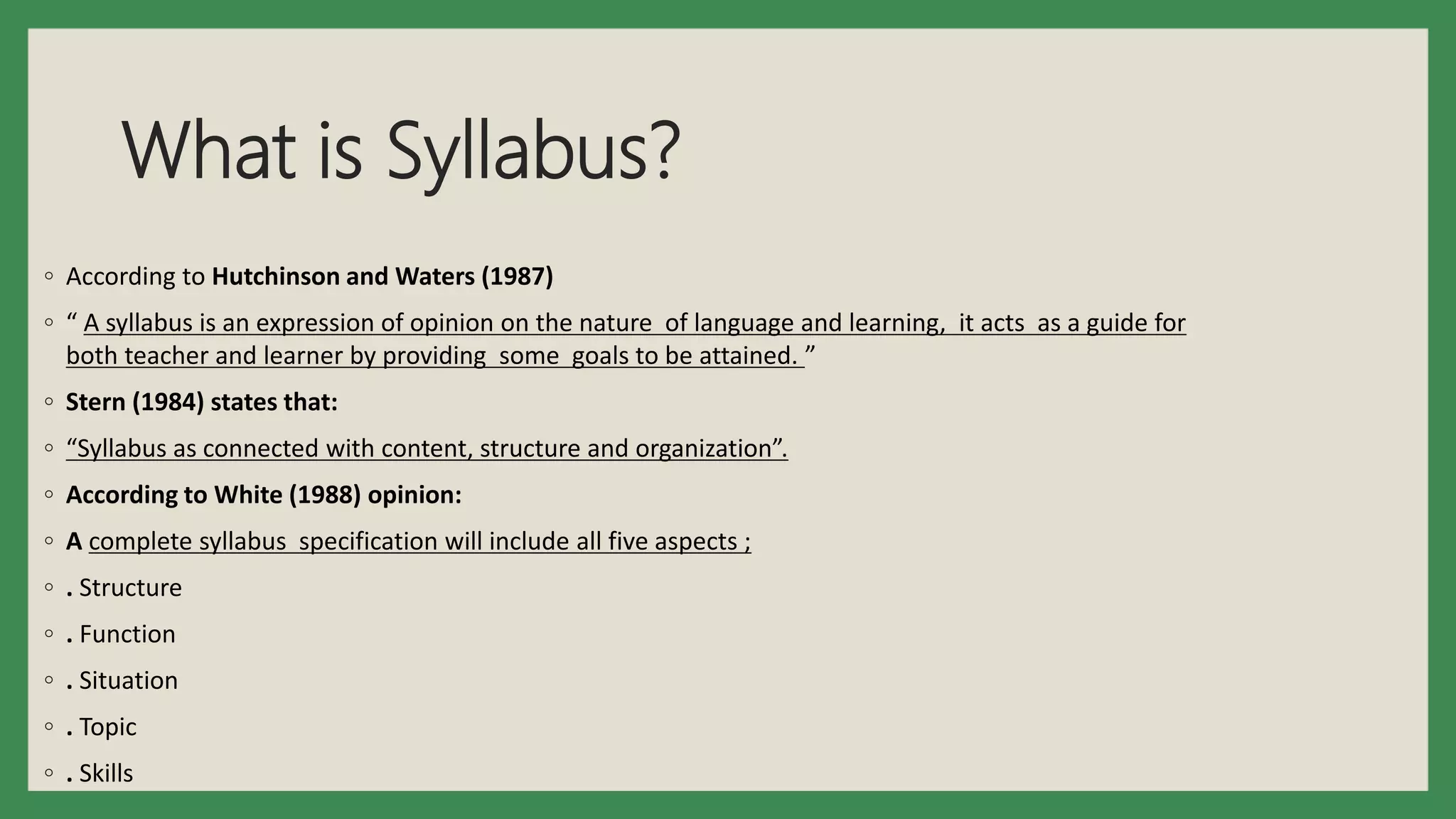 This document discusses syllabus design and different types of syllabi. It defines a syllabus and outlines its key components and functions. It distinguishes between syllabi and curriculum, noting that a syllabus covers topics for a subject while curriculum encompasses broader educational planning. The document also describes different orientations for syllabi, including product-oriented, process-oriented, and natural syllabus approaches. It provides examples of grammatical, functional, analytical, task-based, and content-based syllabi. Overall, the document provides an overview of considerations and steps for effective syllabus design.