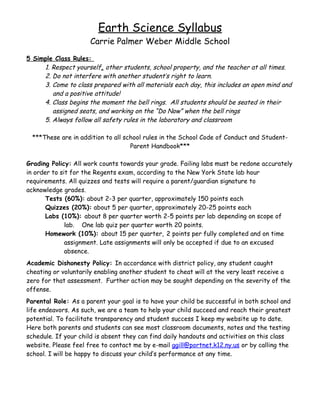 This document is an Earth Science syllabus that outlines the course details and expectations for students. The syllabus introduces Ms. Gill as the teacher and describes the course as a challenging but fun Regents-level class. It provides supplies needed, resources available to students, the curriculum topics that will be covered over the year, basic class rules, and the grading policy. It emphasizes the importance of organization, hard work, and asking questions to succeed. Parents are asked to review the syllabus and return the signed bottom portion.
