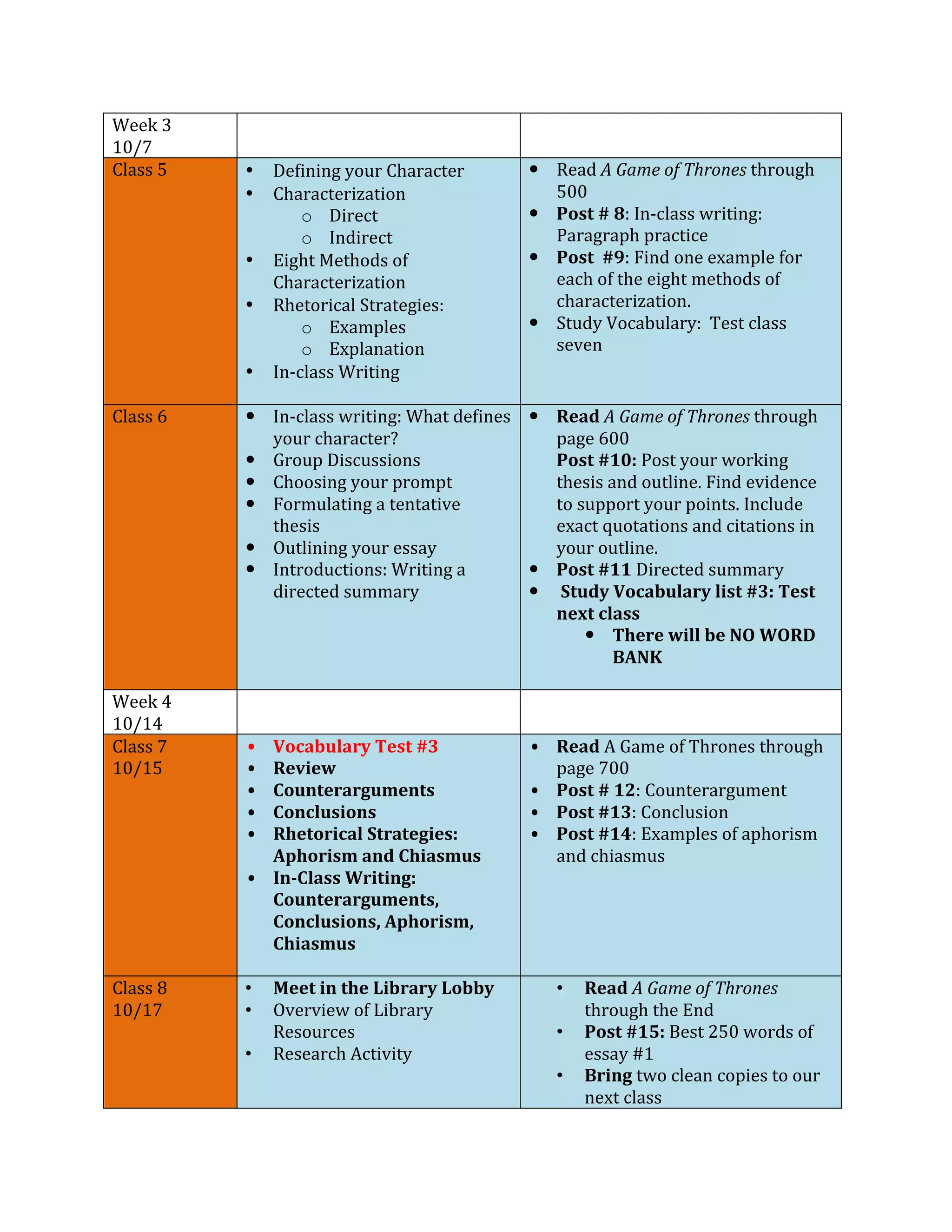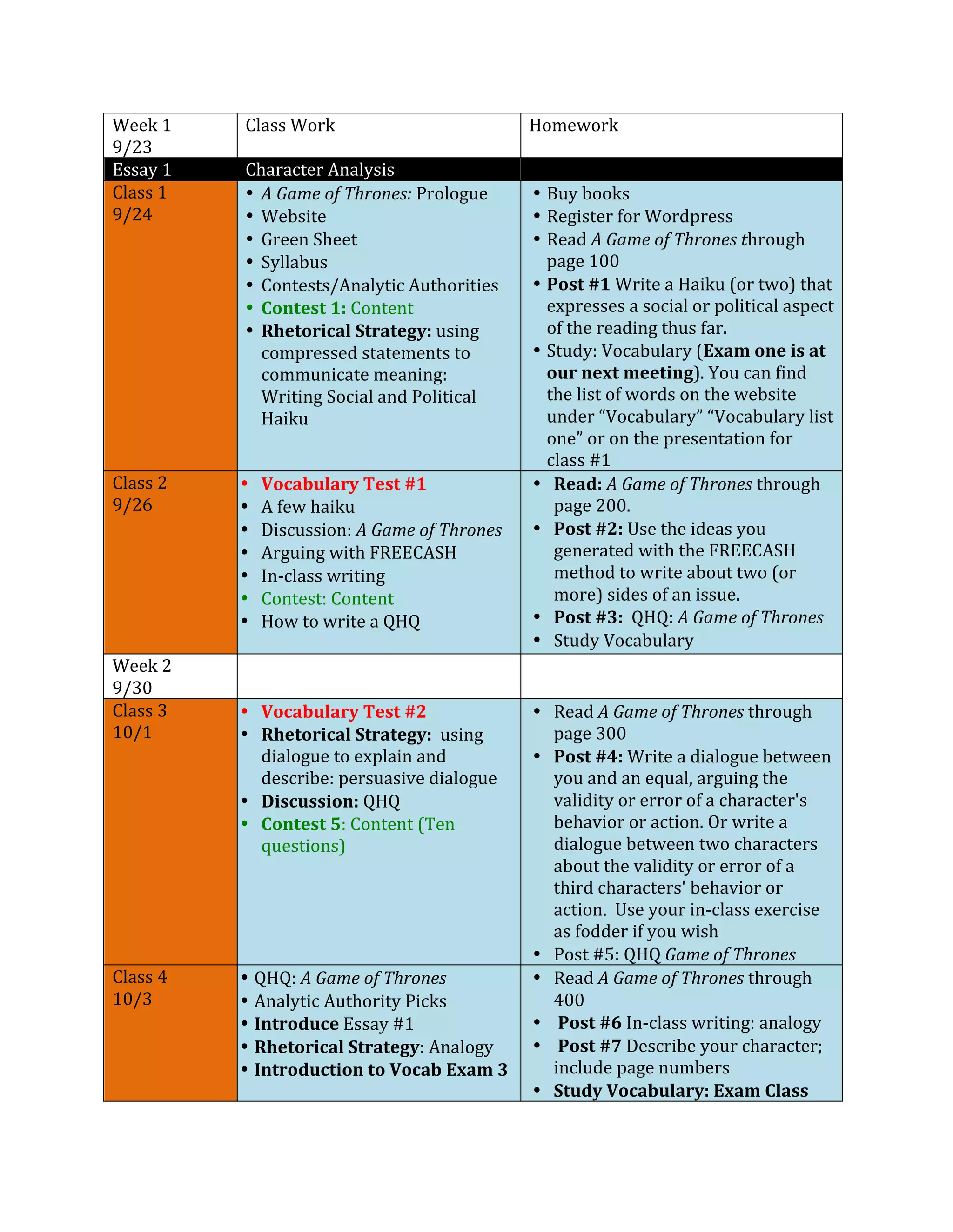 This document provides an overview of the schedule and assignments for a literature class focused on A Game of Thrones. In week 1, students read an excerpt of the book and wrote haiku responses. They learned about rhetorical strategies like using compressed statements. In week 2, students continued reading and discussing the book, writing dialogues and question-hint-question responses. The document outlines the subsequent weeks' activities like vocabulary tests, character analysis essays, and further examinations of rhetorical devices in the text.