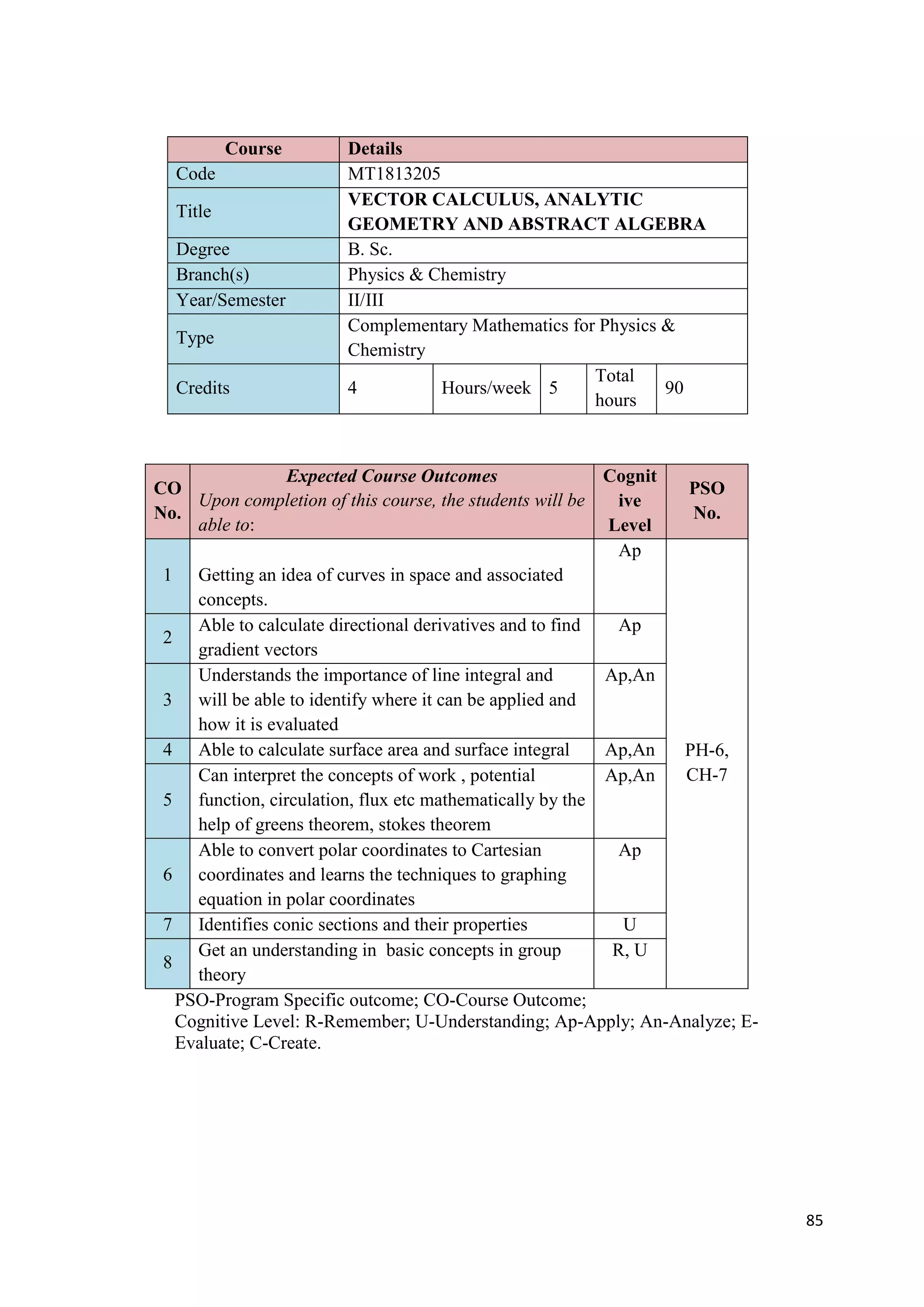 This document provides details of the course "Vector Calculus, Analytic Geometry and Abstract Algebra". The course is for B.Sc. Physics and Chemistry students in the 2nd/3rd semester. It aims to help students understand concepts like curves in space, vector functions, line and surface integrals, polar coordinates, and basic group theory. The 90-hour course is divided into 4 modules covering vector valued functions, integration in vector fields, analytic geometry, and abstract algebra. Students will learn techniques like calculating directional derivatives and gradients, evaluating line and surface integrals, graphing equations in polar coordinates, and properties of groups.