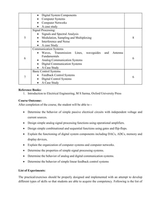 This document outlines the teaching scheme, content, and outcomes of the Basic Electronics course offered at Gujarat Technological University. The course is a 6-credit course taught over 4 lecture hours and 2 practical hours per week. The content covers 6 topics related to circuit concepts, analysis techniques, analog and digital building blocks, signal processing, communication systems, and basic control systems. Upon completing the course, students will be able to analyze electrical circuits, design analog signal processing functions, understand digital systems components, explain signal processing and communication systems, and analyze feedback control systems. The document also lists reference books and experiments to complement the theoretical content.