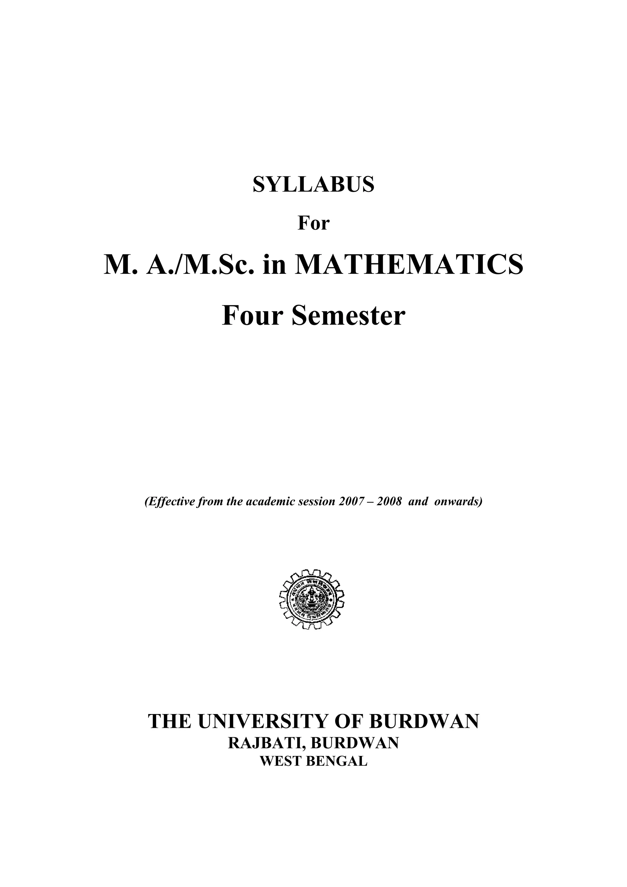 This document outlines the syllabus for a 4-semester M.A./M.Sc. program in mathematics. It describes the course structure, including the distribution of credits and topics covered in each semester. In the first two semesters, all students take the same core courses in topics like functional analysis, linear algebra, complex analysis, and differential equations. In semesters 3 and 4, students can choose between a pure mathematics track or applied mathematics track, and take both core and specialized courses in their chosen track. Detailed topics are provided for each course across the 4 semesters of the program.