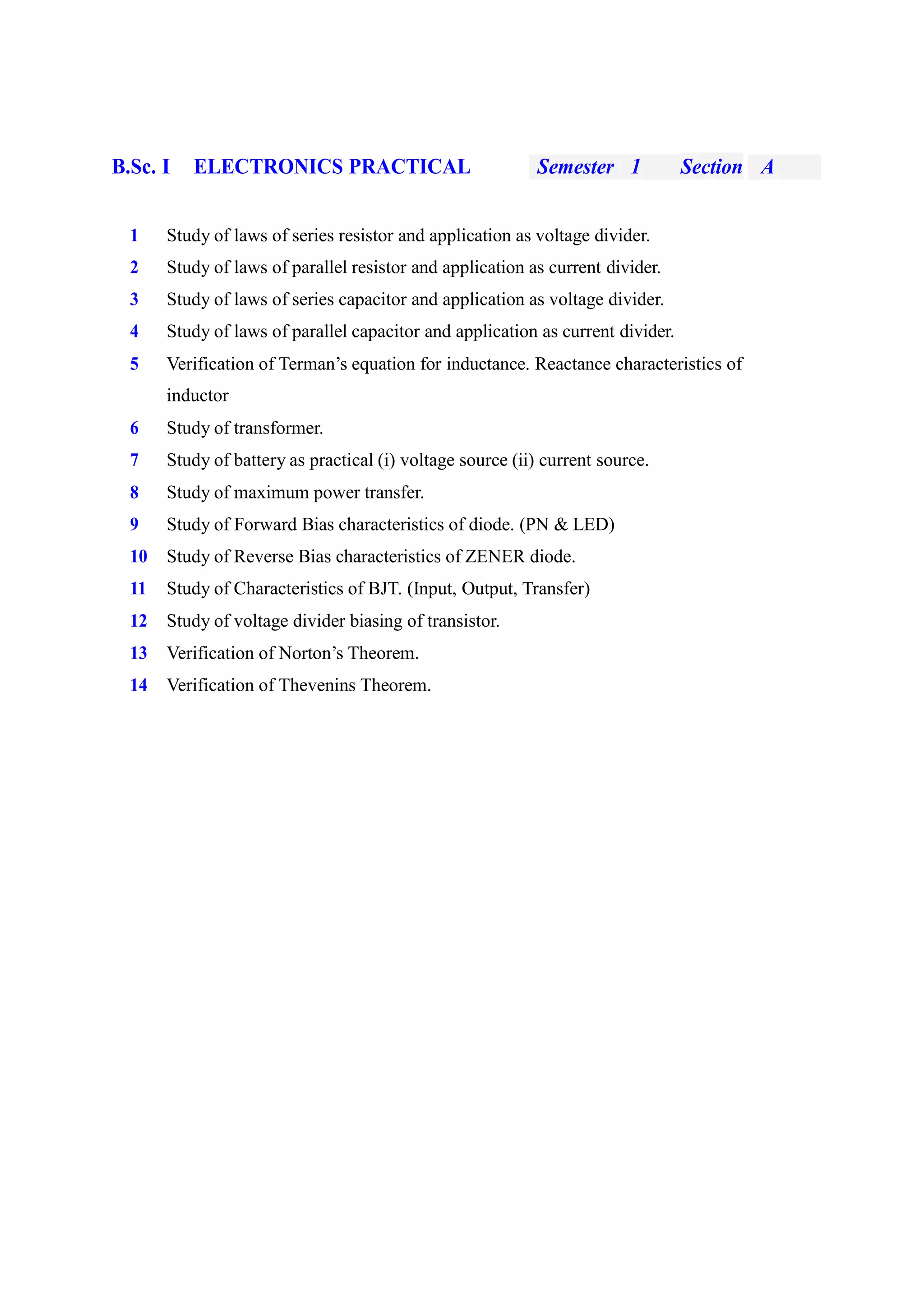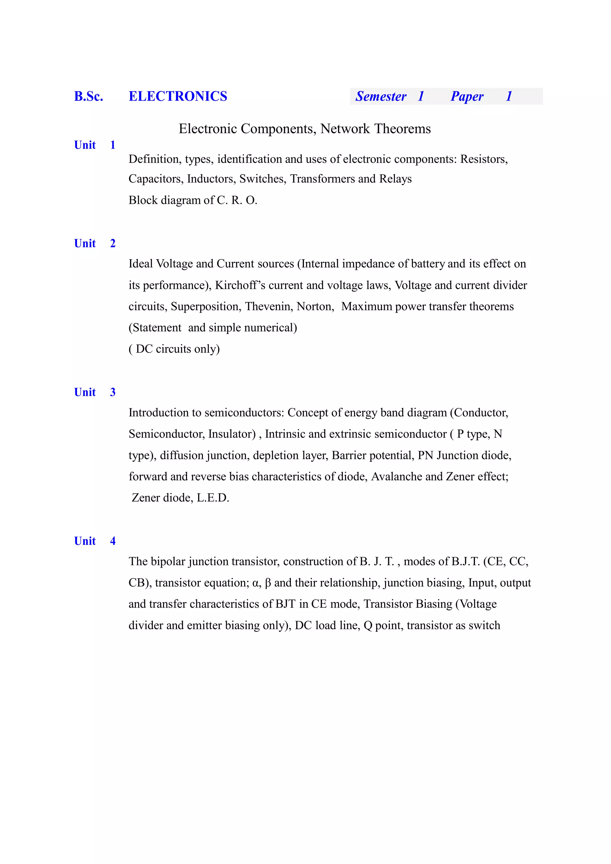 This document contains information about various topics covered in B.Sc Electronics Semester 1. It includes 4 units for Paper 1 on Electronic Components, Network Theorems and DC circuits. It also includes 4 units for Paper 2 on fundamentals of digital electronics covering number systems, logic gates, Karnaugh maps and combinational logic circuits. It lists practical experiments related to both papers. It provides reference books for both subjects. Overall, the document outlines the syllabus, topics and experiments for the first semester of a B.Sc Electronics degree.