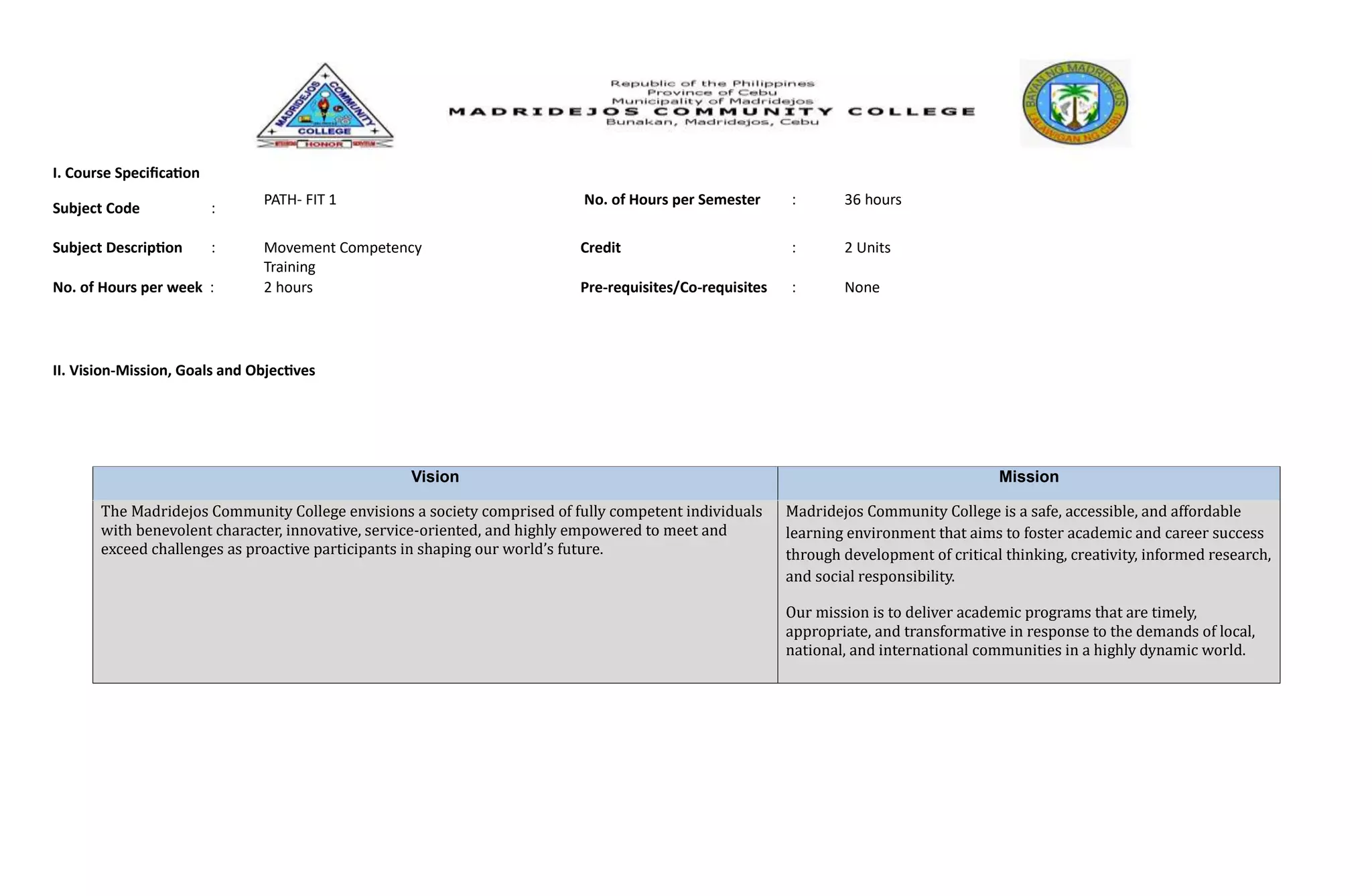 This document outlines a course on movement competency training. The 36-hour, 2-unit course aims to reintroduce fundamental movement patterns and integrate them with core training to meet functional fitness demands. Students will enhance their fitness levels and adapt movements for independent physical activity through exercise progression and evaluation of fitness, activity, and eating goals. The course outcomes relate to developing knowledge of physical activity benefits, achieving personal fitness and wellness goals, and engaging in moderate to vigorous physical activities to improve fitness and health. Students will be evaluated based on exams, outputs, and attendance, with the final grade determining if they pass or fail the course.