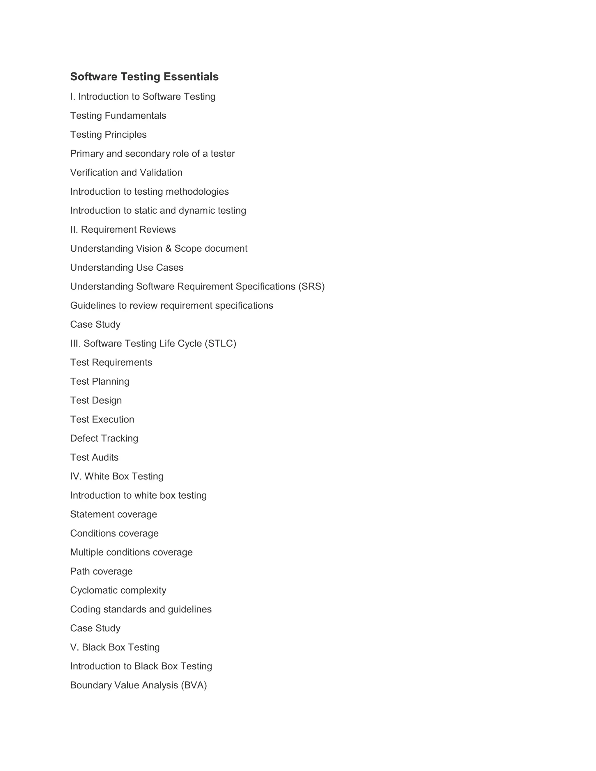 This document outlines a software testing curriculum covering various testing methodologies, techniques, and best practices. It includes sections on testing fundamentals, requirement reviews, test planning and execution across different phases, white and black box testing techniques, test planning, defect reporting and tracking, and testing in common software development life cycles. The overall goal is to introduce readers to core concepts in software quality assurance and provide guidance for implementing effective testing strategies.