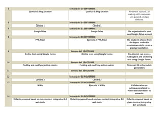 This document outlines the modules, topics, and assignments for an educational technology course taught over 18 weeks. The course covers various web 2.0 tools like blogs, wikis, podcasts and how they can be used for language teaching. Students will create accounts and content on platforms like Pinterest and Google Drive. They will also use Google Forms to create online reading and listening tests. Later modules focus on developing teaching proposals that integrate web 2.0 tools and comparing learning management systems like Edmodo and Moodle. Evaluation includes exams during the final two weeks.