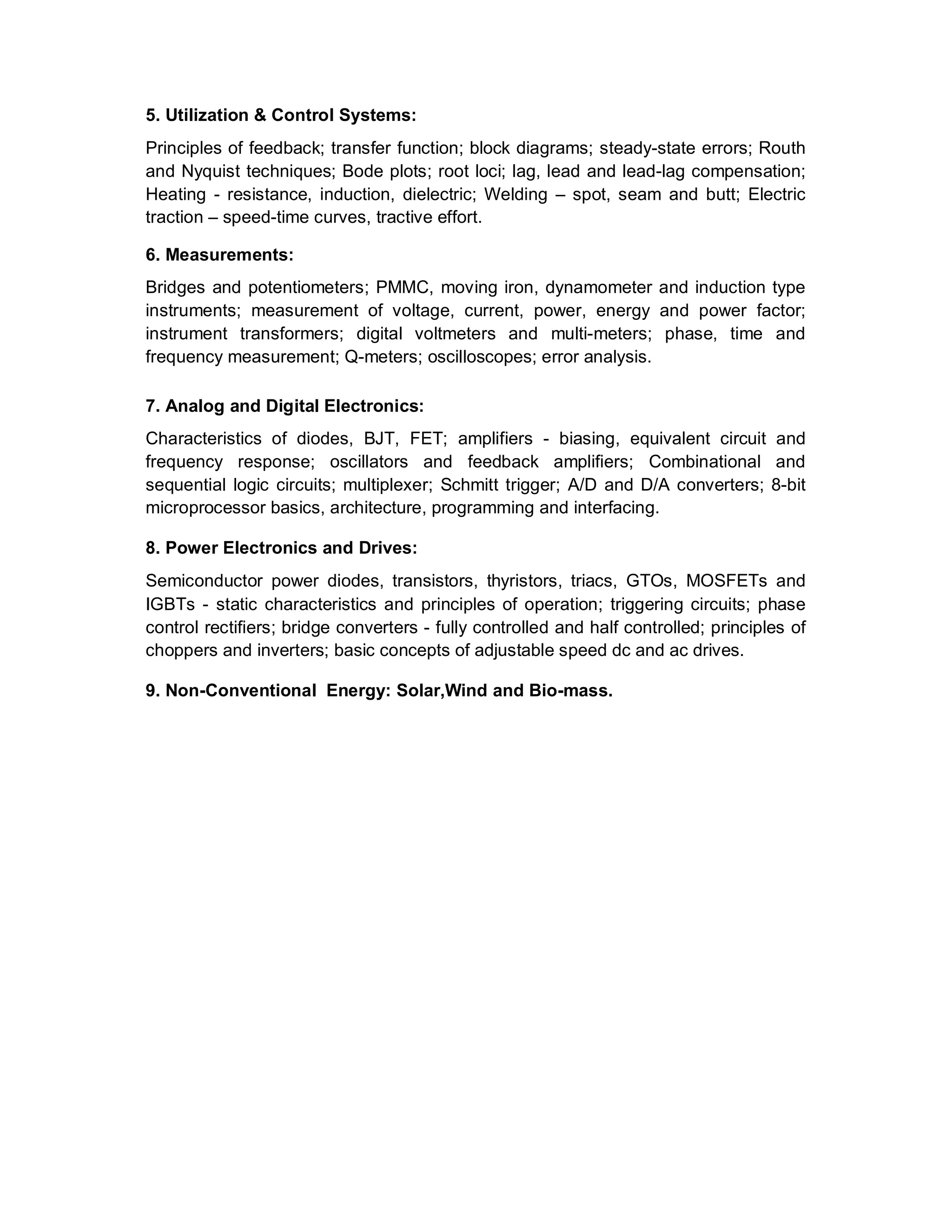 For Electrical, the syllabus covers topics like electric circuits, electrical machines, power systems, switchgear equipment, utilization and control systems, measurements, analog and digital electronics, power electronics and drives, and non-conventional energy.