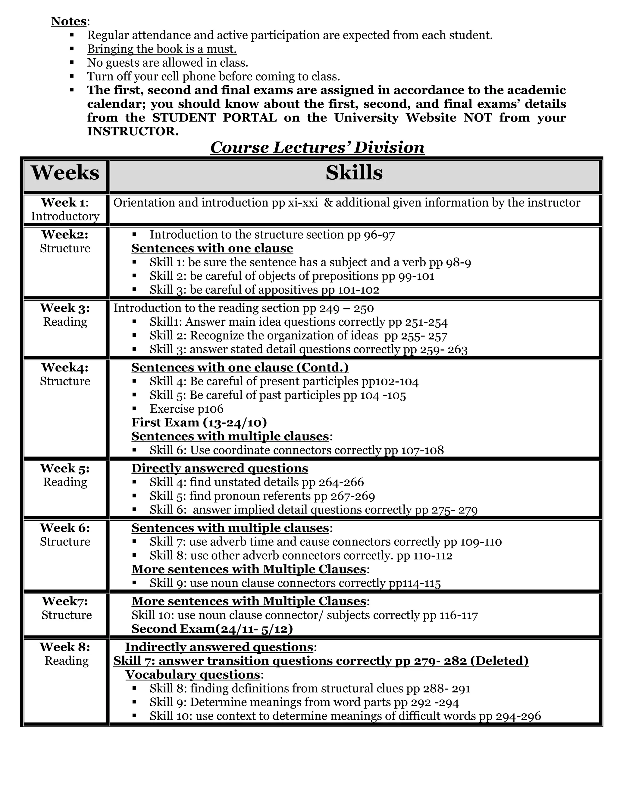 This document provides information about an English language course offered at The Hashemite University. The course aims to prepare students to take the TOEFL test by focusing on reading and structure. It will enrich students' vocabulary and expose them to challenging texts and current English usage. Students will analyze language systems and learn strategies to approach different text types. The course also aims to enable students to use English fluently and sit for entrance exams required for university study in the US and Jordan. The course will be evaluated based on three online exams. Lectures over 12 weeks will cover skills like determining main ideas, word meanings, and sentence structures.