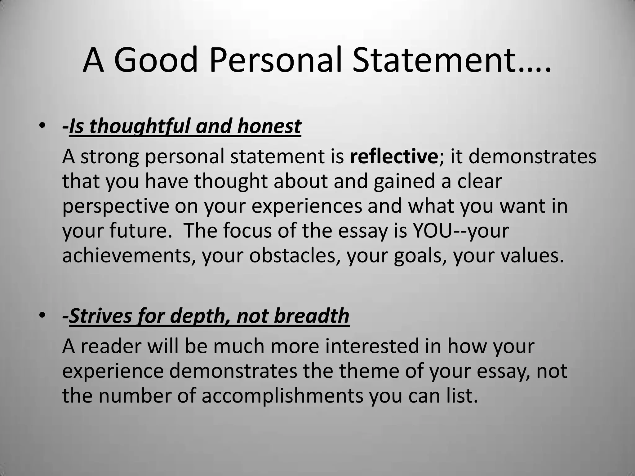 The document provides guidance on writing an effective personal statement for college applications. It outlines several key elements of a strong personal statement, including being thoughtful and honest, focusing on depth rather than breadth, following good writing conventions, directly answering the prompt, incorporating feedback, demonstrating knowledge of the intended major or college, reframing weaknesses as strengths, and exuding confidence. The document also provides tips for brainstorming experiences and qualities to include in the personal statement.