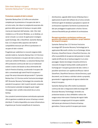 Symantec Backup Exec 12.5 è una soluzione di backup e recupero per ambienti Windows, progettata per proteggere dati critici sia su server fisici che virtuali. Include funzionalità avanzate come il recupero granulare e la protezione continua dei dati, consentendo un recupero rapido di e-mail e documenti. Il software offre anche integrazioni multiprodotto, miglioramenti alle prestazioni e opzioni di archiviazione scalabili per ottimizzare la gestione dei backup.