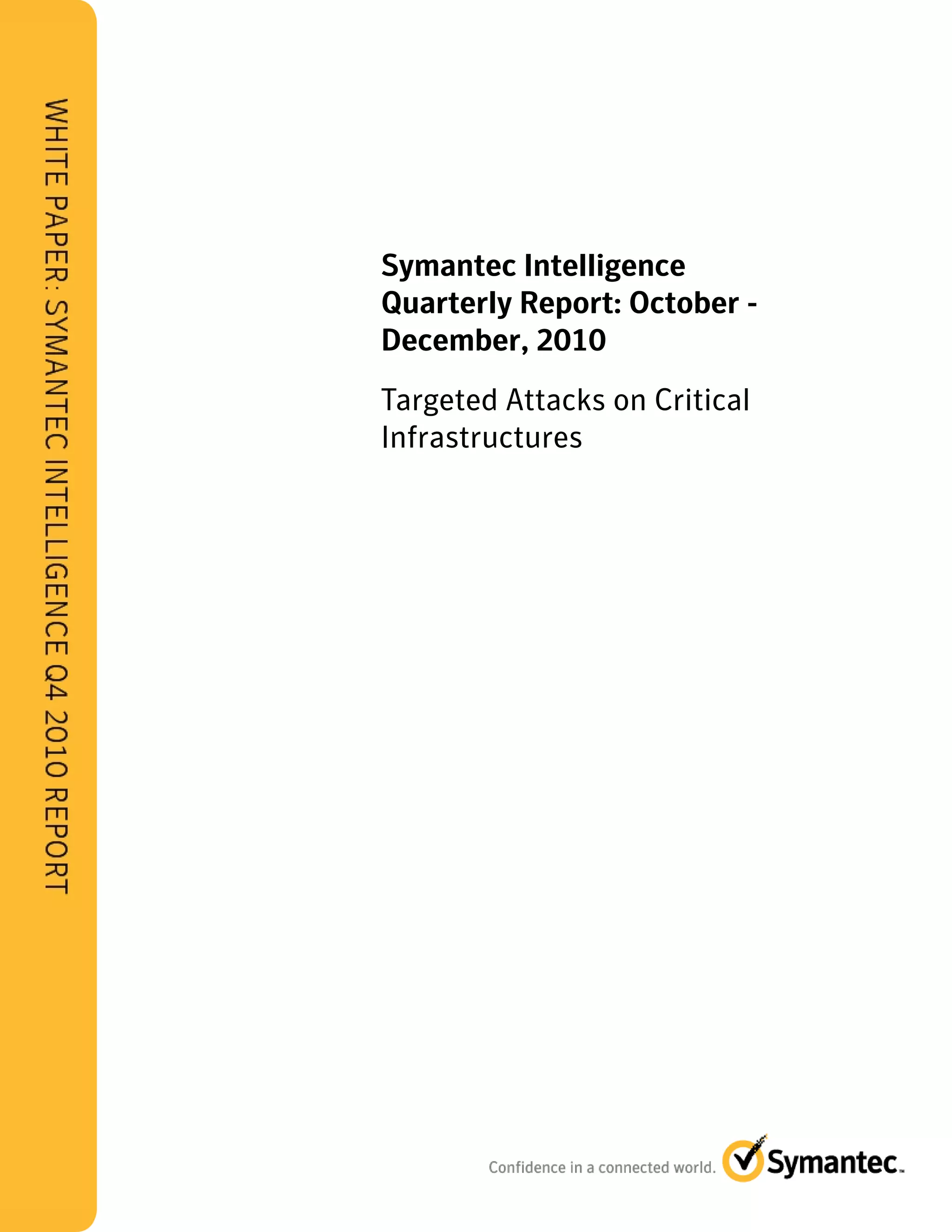 The Symantec Intelligence Quarterly Report details targeted attacks on critical infrastructures during Q4 2010, highlighting specific threats such as the Trojan Hydraq and the Stuxnet worm. These advanced persistent threats (APTs) are particularly dangerous due to their customization and ability to exploit vulnerabilities, especially within SCADA systems used for monitoring essential services. The report emphasizes that such tailored attacks can disrupt crucial operations across various sectors, including transportation and utilities, with significant implications for societal safety.