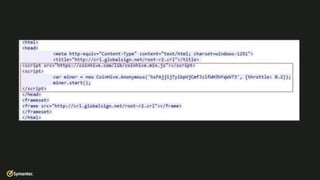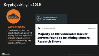 The document appears to be a report on internet security threats in 2019. It discusses the rise of cryptojacking malware infecting apps on the Microsoft Store and notes that cryptojacking was patched in April 2018. It also discusses a supply chain attack on Ticketmaster that resulted in formjacking. The report examines the underground economy fueled by criminal hacking and estimates underground cybercrime profits to be over $1.5 billion for 2018 alone. It provides statistics on stolen credit card numbers and estimates criminals could earn over $2.2 million per month selling access to stolen credit cards on just 10 websites.