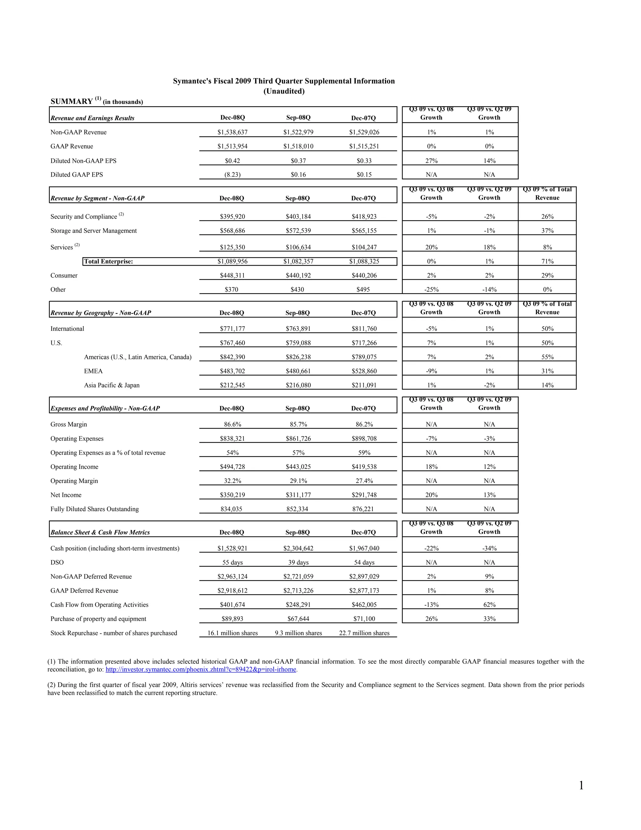 Symantec reported its fiscal 2009 third quarter supplemental financial information. Key highlights include: - Non-GAAP revenue increased 1% year-over-year to $1.538 billion. GAAP revenue was flat at $1.514 billion. - Diluted non-GAAP EPS grew 27% to $0.42. Diluted GAAP EPS was $(8.23). - Security and compliance revenue declined 5% to $396 million. Storage and server management grew 1% to $569 million. - International revenue declined 5% to $771 million. US revenue grew 7% to $768 million. - Operating expenses declined 7% to $838 million. Operating income grew 18