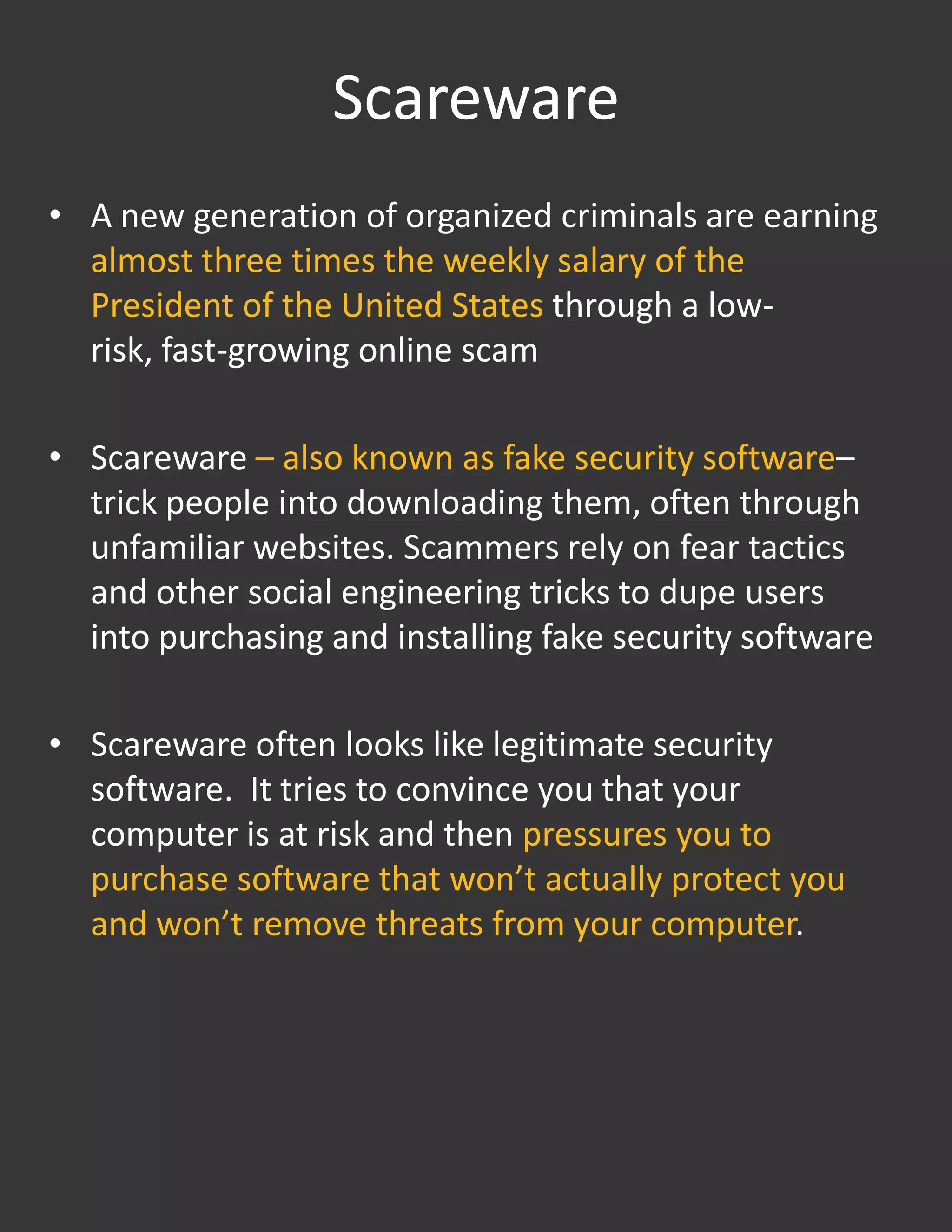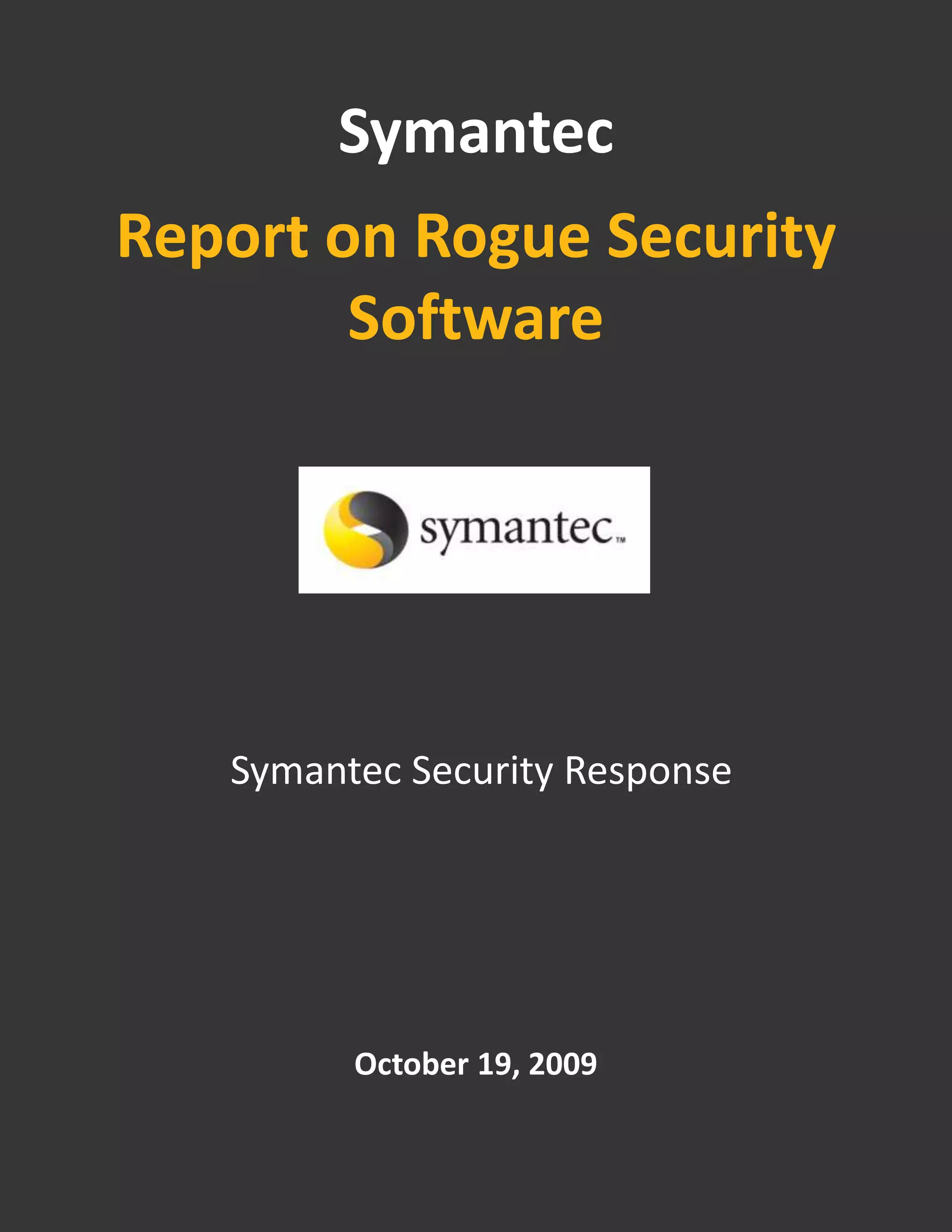 The Symantec report details the rise of scareware, a form of rogue security software that tricks users into purchasing fake security solutions through fear tactics and social engineering. Scammers earn substantial profits using an affiliate model, often leading to identity theft and weakening of actual security on users' computers. The report highlights the widespread nature of this issue, with 43 million installation attempts reported and various prevention strategies suggested for consumers.