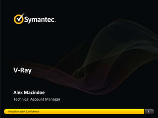 The document discusses V-Ray's capabilities in managing virtual and physical systems, emphasizing visibility into rogue virtual machines, backup failures, and compliance issues. It highlights the challenges of virtualization security, including evolving threats and data mobility, while also addressing the need for optimized storage and data protection. Additionally, it points out the importance of ensuring application availability and minimizing costs in virtualization projects.