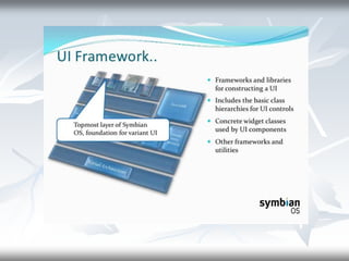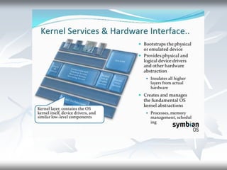 The document provides an overview of the Symbian operating system, its evolution since its inception in 1998, and its key features. It highlights the development of mobile applications across various categories and the improvements in functionality over time, including support for multimedia and advanced communication protocols. Additionally, it discusses the programming languages used in Symbian OS and the system's architecture designed for smartphones.