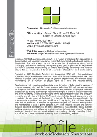 Symbiotic Architects & Associates is an architectural firm based in Dhaka, Bangladesh that specializes in residential, commercial, and industrial building projects. The firm was founded in 1998 and is led by Principal Architect ABMS Zaman, who has over 20 years of experience. Some of Symbiotic's notable past projects include the Western Motijheel View Tower multi-unit residential complex, Aziz Tower commercial building, and Akij Particle Board Ltd industrial development. The firm employs a team of architects, engineers, and designers to provide full architectural and engineering services for its clients.