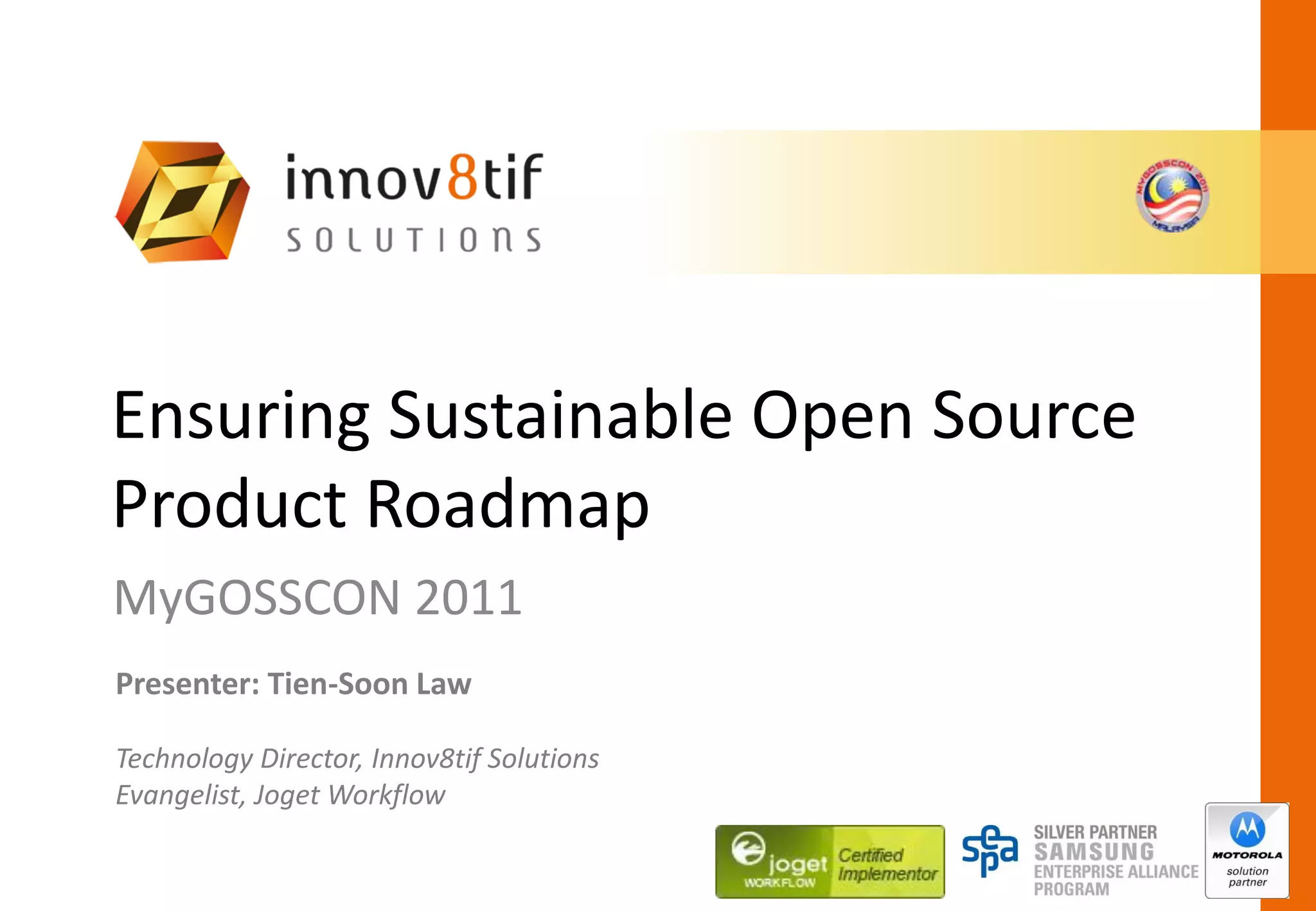 This document discusses ensuring the sustainable development of open source products. Open source software sustainability is pursued by creating value for all stakeholders. Some key ways to sustain open source product development include corporate sponsorship and generating revenue from services, complementary products, and support/training. While open source software is initially free, 3% of users on average become paying customers. A case study of the open source product Joget Workflow shows how it was able to sustain development through consulting, training, implementation services, and an enterprise edition to generate over $500k in funding in under 2 years.