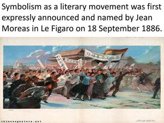 Symbolism was a literary movement that began in 1886 as a reaction against rigid French poetry. It aimed to use symbols to represent ideas and emotions rather than directly expressing them. Key features included obscure references open to multiple interpretations, repetition for suggestive effect, and using colors and language figuratively rather than literally. Major symbolist poets were Wallace Stevens, T.S. Eliot, Ezra Pound, and W.B. Yeats. The movement sought to express the subconscious and blend perceptions in a way that moved fluidly between objective and subjective experience.