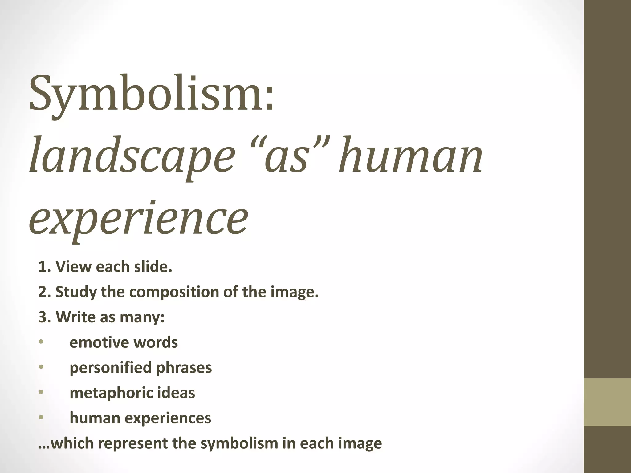 The document provides instructions for an activity on symbolism in landscape images. Students are asked to view each slide, study the composition, and write emotive words, personified phrases, metaphors, and descriptions of human experiences that represent the symbolism conveyed by each image.