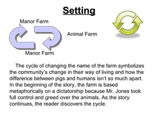 The document analyzes various symbols in Animal Farm by George Orwell. It discusses how the farm's name changing symbolizes the community's changing way of life. The farmhouse represents the humans' oppressive habits. The barn shelters the commandments and provides rest for the animals. The flag symbolizes the animals' hope and freedom. The windmill and whip show the return of human behaviors under Napoleon's rule.