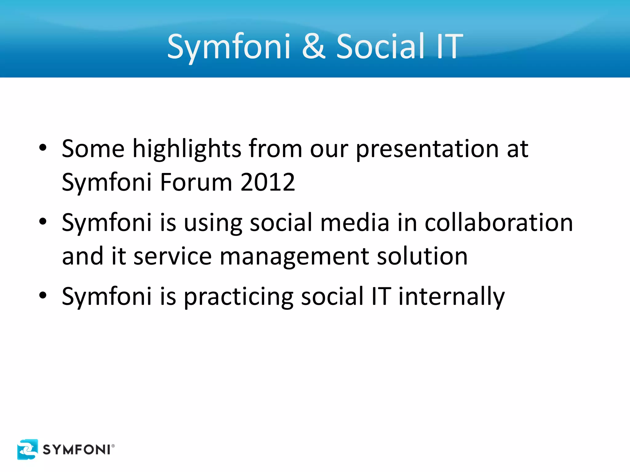 The document discusses how Symfoni, a collaboration and IT service management solution provider, uses social media internally and with clients. It provides examples of how social IT can help IT departments and businesses by facilitating knowledge sharing, reducing costs, and creating searchable information repositories. Social IT allows businesses to help themselves through community support and gives IT new ways to communicate and collaborate with users. The document encourages organizations to allocate resources to train users and staff on social IT platforms in order to fully realize the benefits.