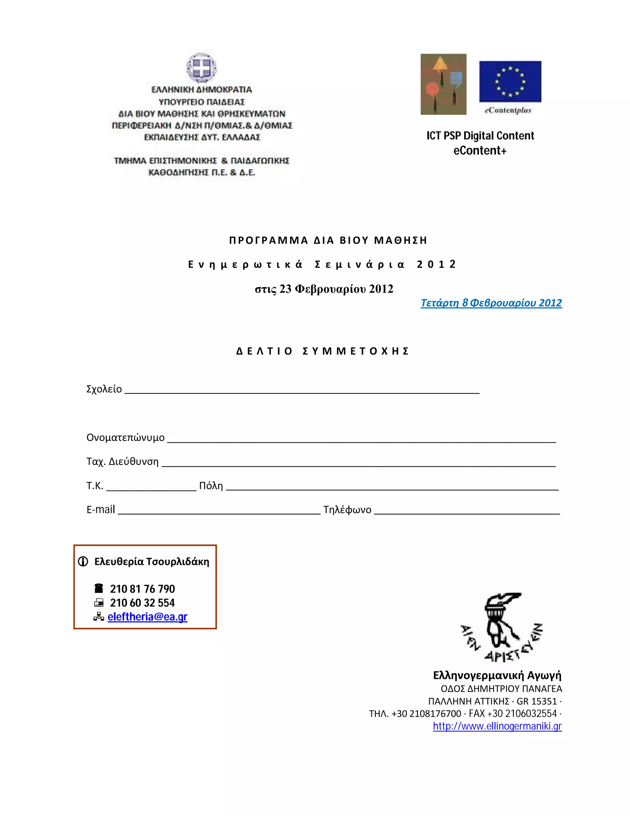 Content eContent+ ΠΡΟΓΡΑΜΜΑ ΔΙΑ ΒΙΟΥ ΜΑΘΗΣΗ Ε ν η μ ε ρ ω τ ι κ ά Σ ε μ ι ν ά ρ ι α 2 0 1 2 στις 23 Φεβρουαρίου 2012 Τετάρτη 8 Φεβρουαρίου 2012 ΔΕΛΤΙΟ ΣΥΜΜΕΤΟΧΗΣ Σχολείο _______________________________________________________________ Ονοματεπώνυμο _____________________________________________________________________ Ταχ. Διεύθυνση ______________________________________________________________________ Τ.Κ. ________________ Πόλη ___________________________________________________________ Ε-mail ____________________________________ Τηλέφωνο _________________________________ Ελευθερία Τσουρλιδάκη 210 81 76 790 210 60 32 554 eleftheria@ea.gr Ελληνογερμανική Αγωγή ΟΔΟΣ ΔΗΜΗΤΡΙΟΥ ΠΑΝΑΓΕΑ ΠΑΛΛΗΝΗ ΑΤΤΙΚΗΣ · GR 15351 · ΤΗΛ. +30 2108176700 · FAX +30 2106032554 · http://www.ellinogermaniki.gr
