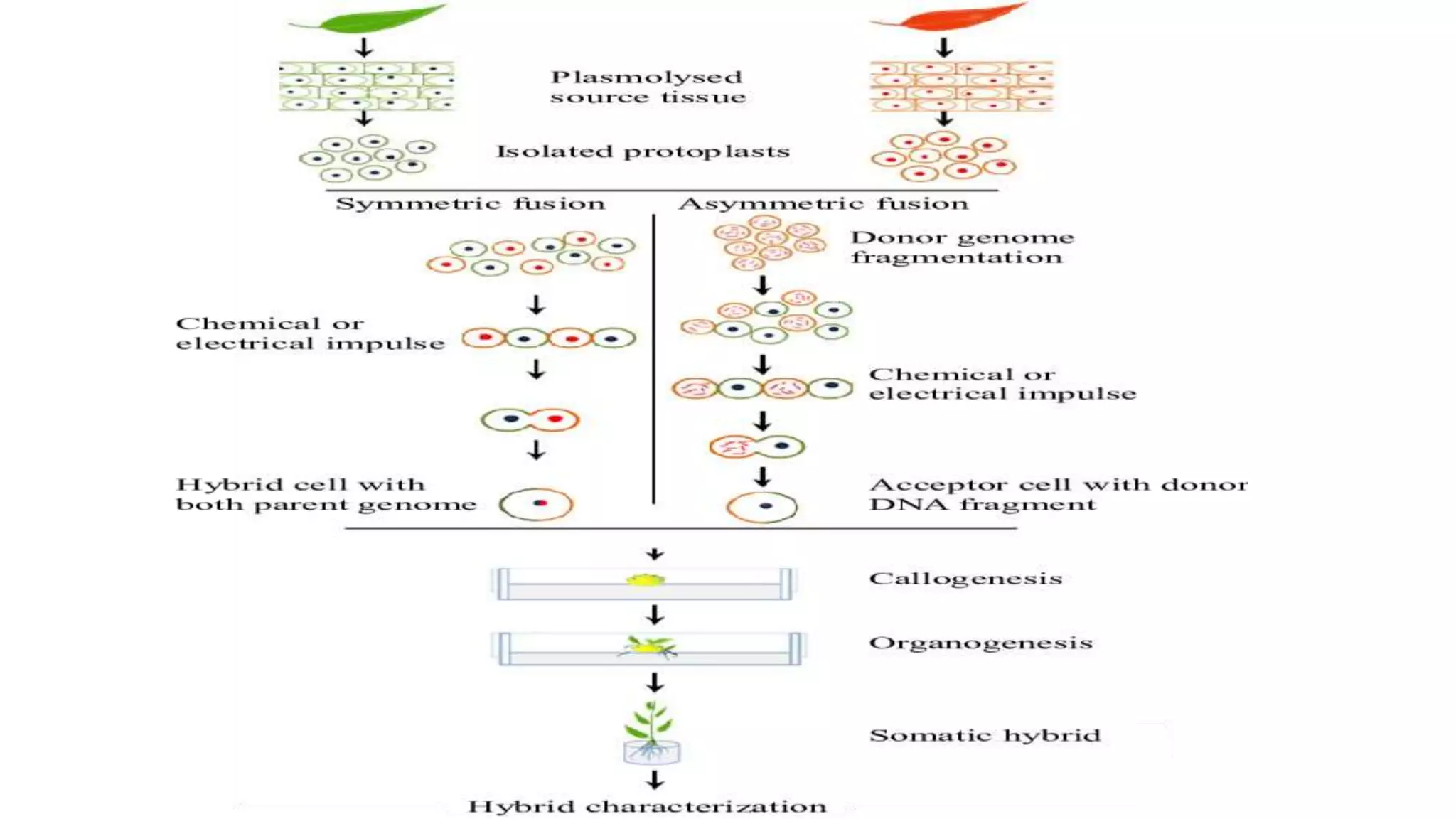 The document discusses symmetric and asymmetric somatic hybrids and cybrids in plant tissue culture. It defines symmetric hybrids as retaining chromosomes from both parents and asymmetric hybrids as retaining chromosomes from only one parent. Recent examples of cybrid production are provided, including transferring cytoplasmic male sterility from Satsuma mandarin to seedy citrus cultivars and introducing transformed tobacco chloroplasts into petunia. Cybridization allows for combining plant species that cannot reproduce sexually by fusing protoplasts such that the nucleus of one species is combined with the cytoplasm of another.
