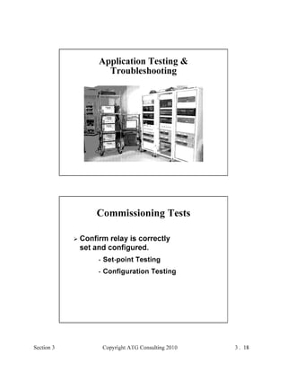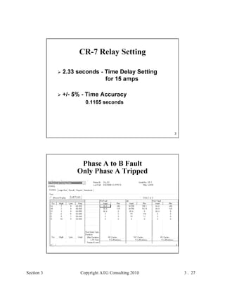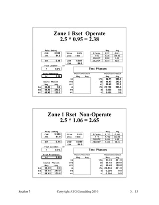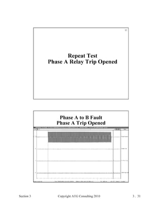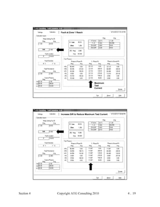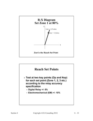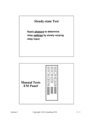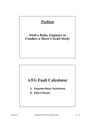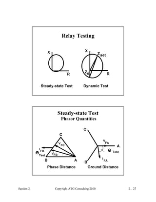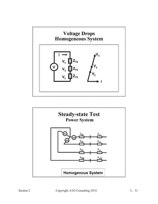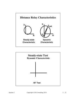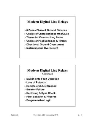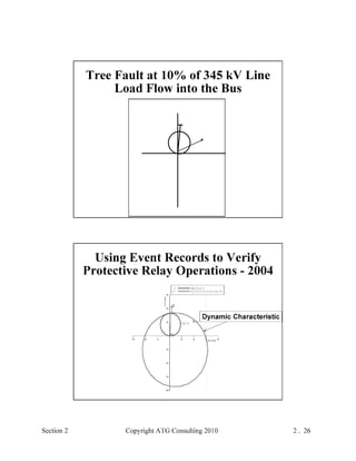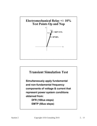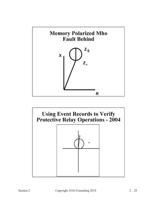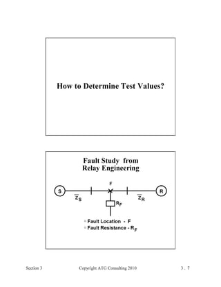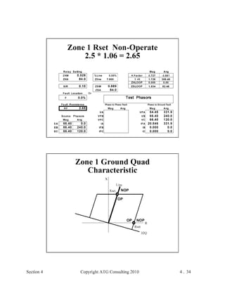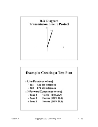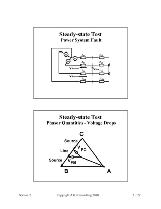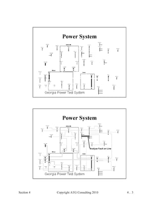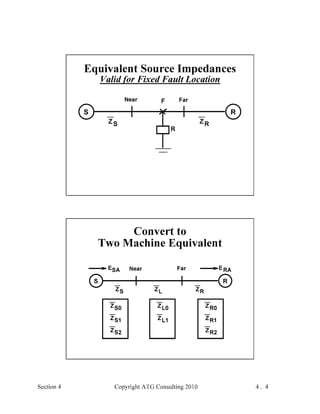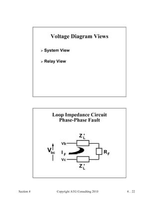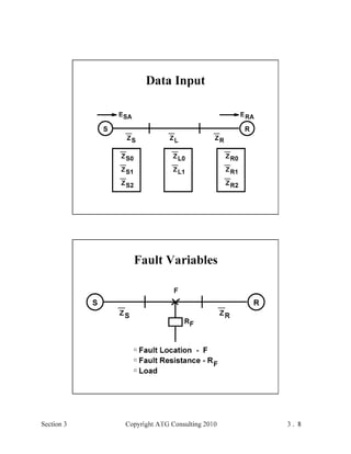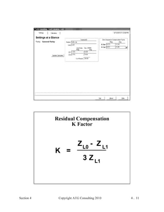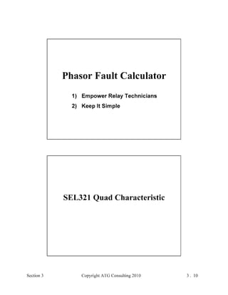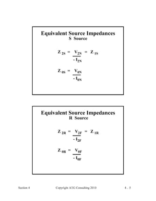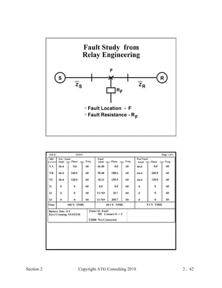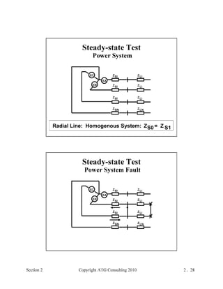 This document provides an outline and overview of a hands-on relay school covering transmission protection theory including symmetrical components and fault calculations. It discusses power system problems like faults and disturbances, different fault types, and introduces symmetrical components and how they are used to analyze balanced and unbalanced systems. It also covers per unit systems, calculating sequence networks for faults, and evaluating transmission line, generator, and transformer impedances.